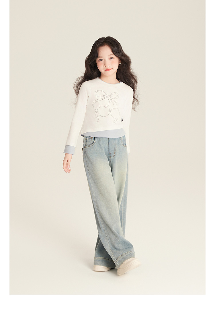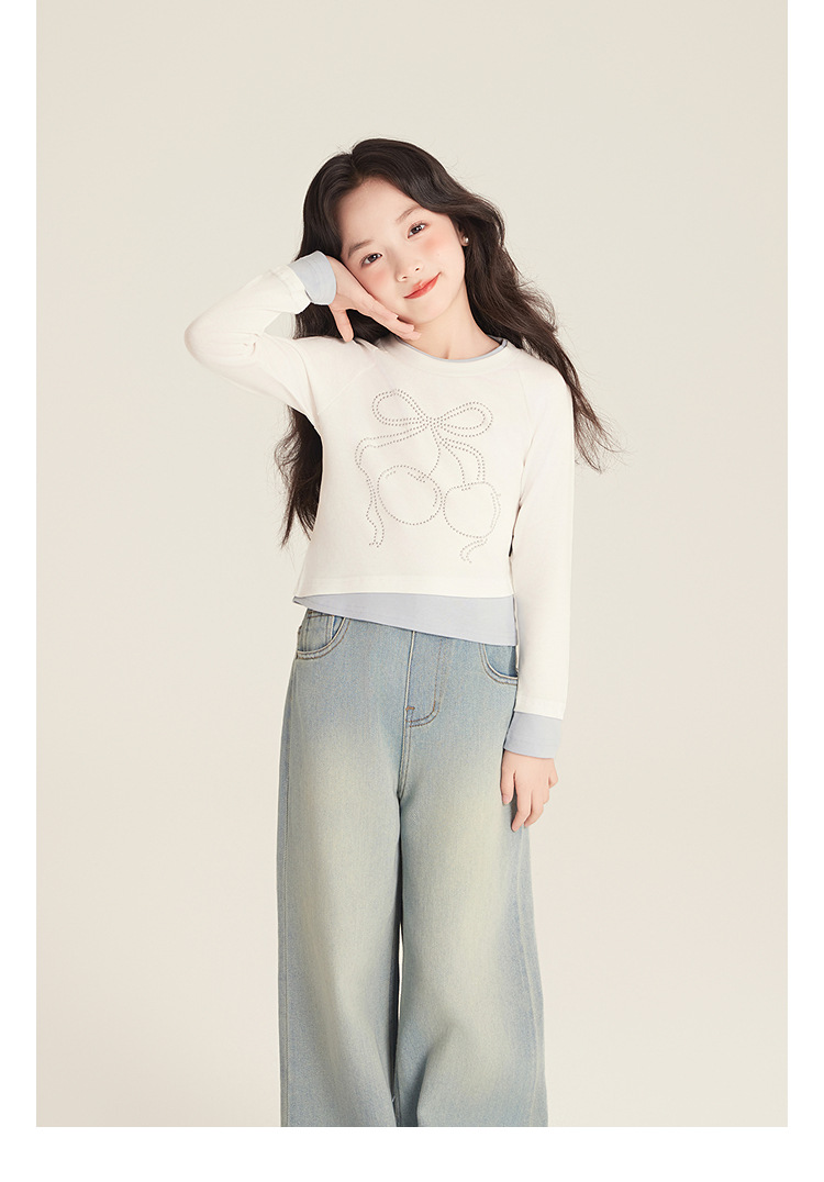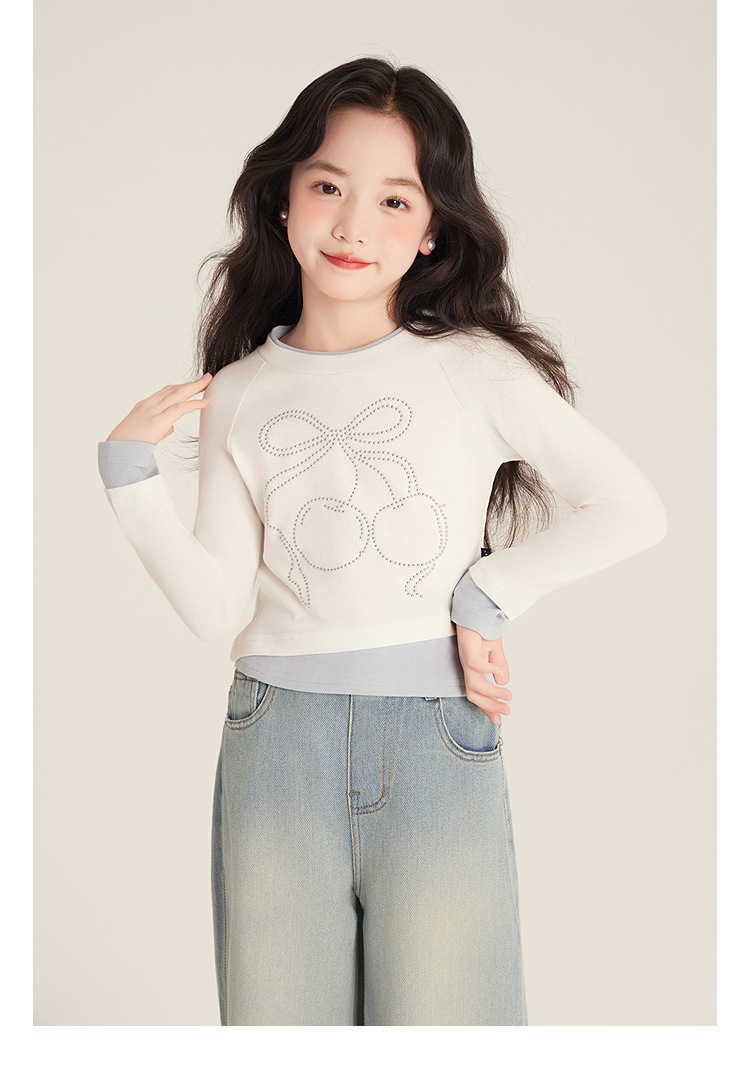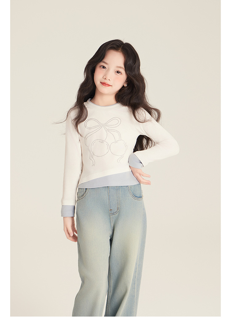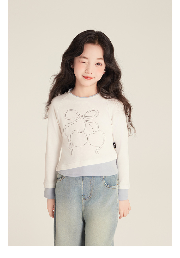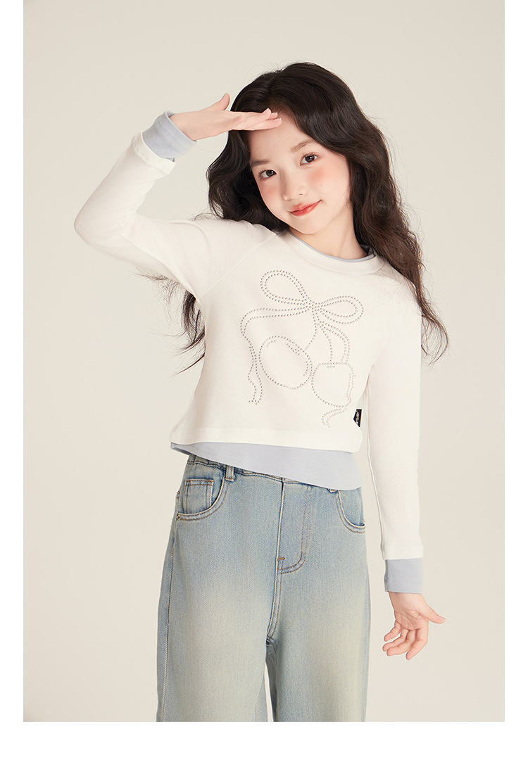 Amybaby Girls 'Top Spring 2025 새로운 한국 스타일 가짜 투피스 컬러 매칭 라인스톤 하단 활 티셔츠