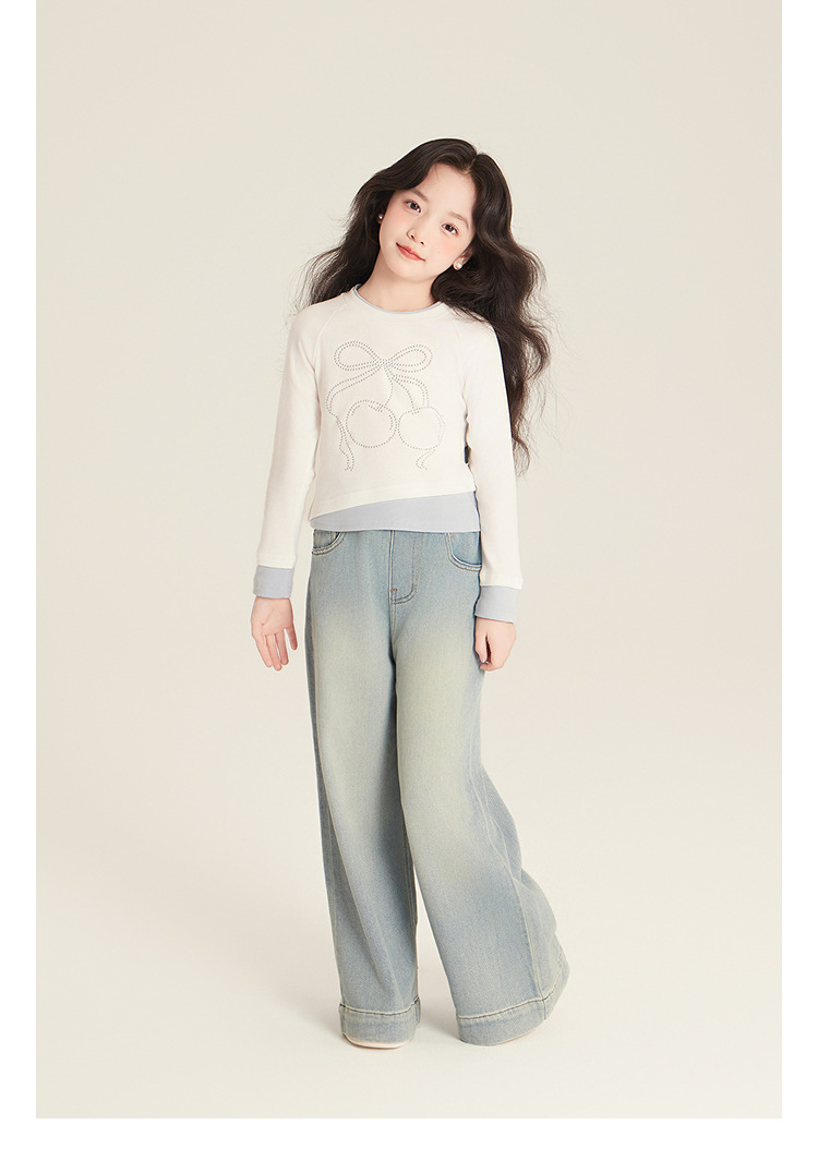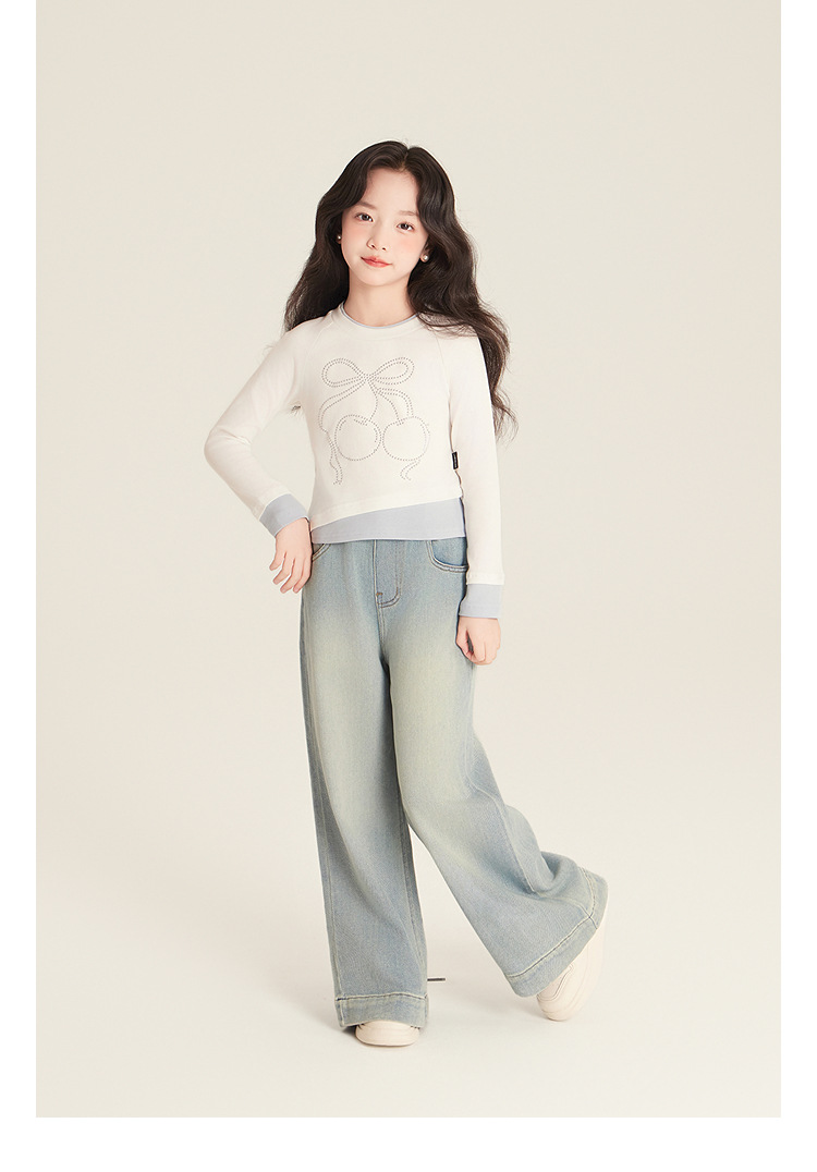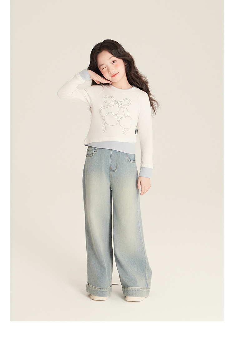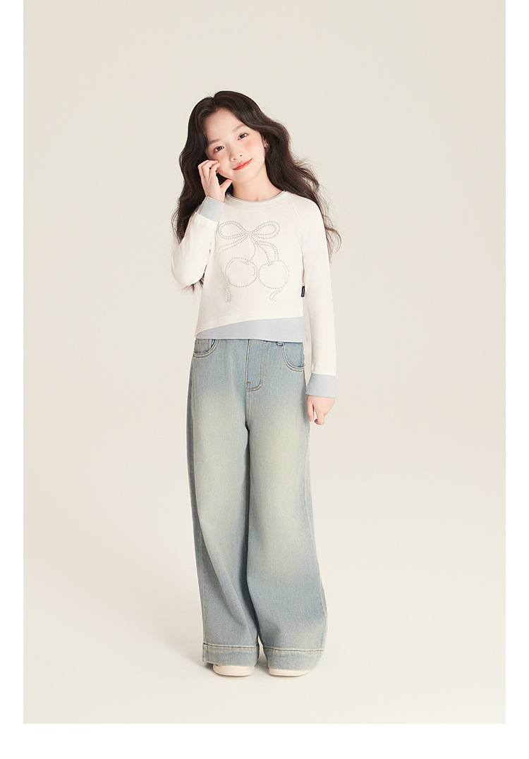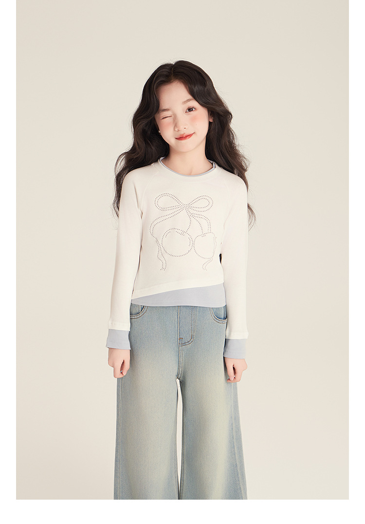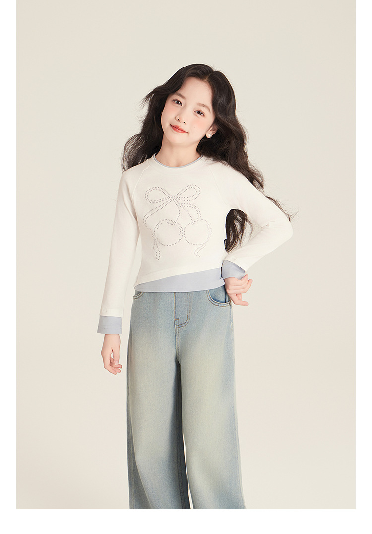 Amybaby Girls 'Top Spring 2025 새로운 한국 스타일 가짜 투피스 컬러 매칭 라인스톤 하단 활 티셔츠