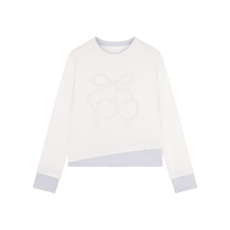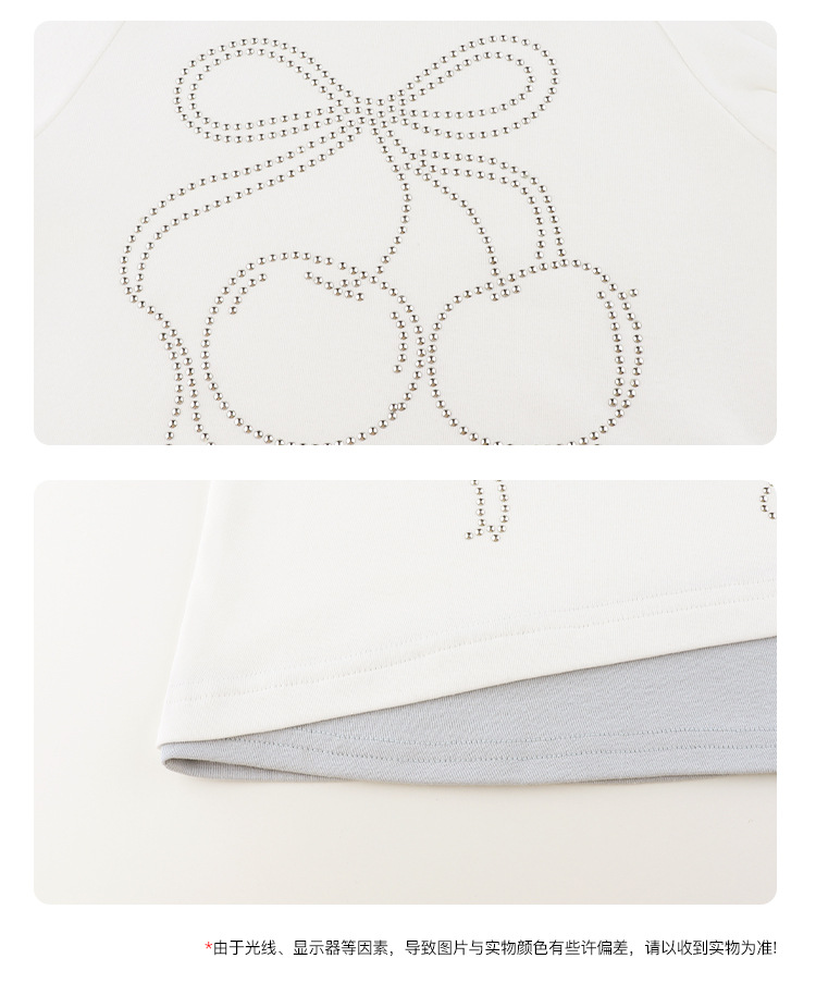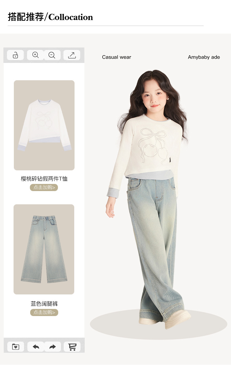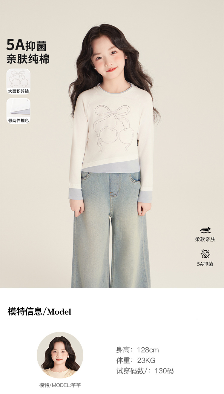 Amybaby Girls 'Top Spring 2025 새로운 한국 스타일 가짜 투피스 컬러 매칭 라인스톤 하단 활 티셔츠스토어 가기