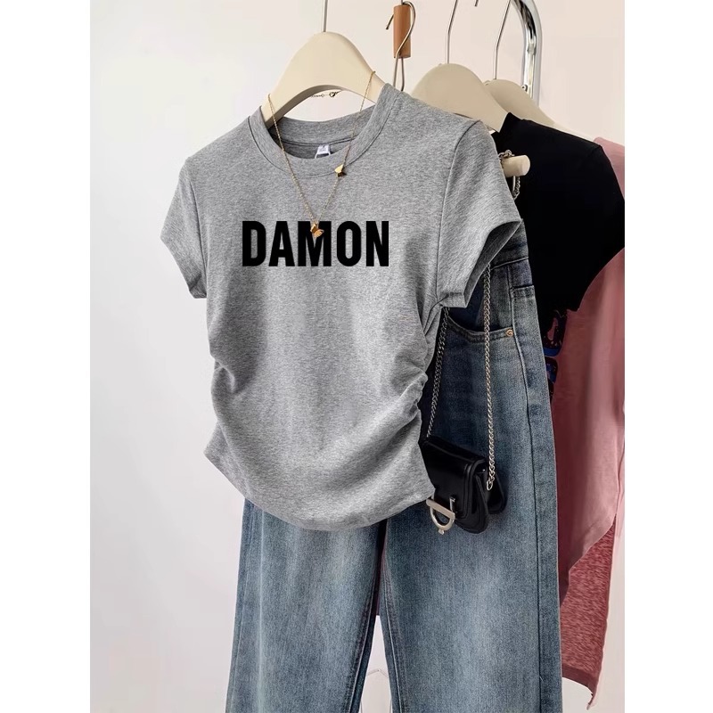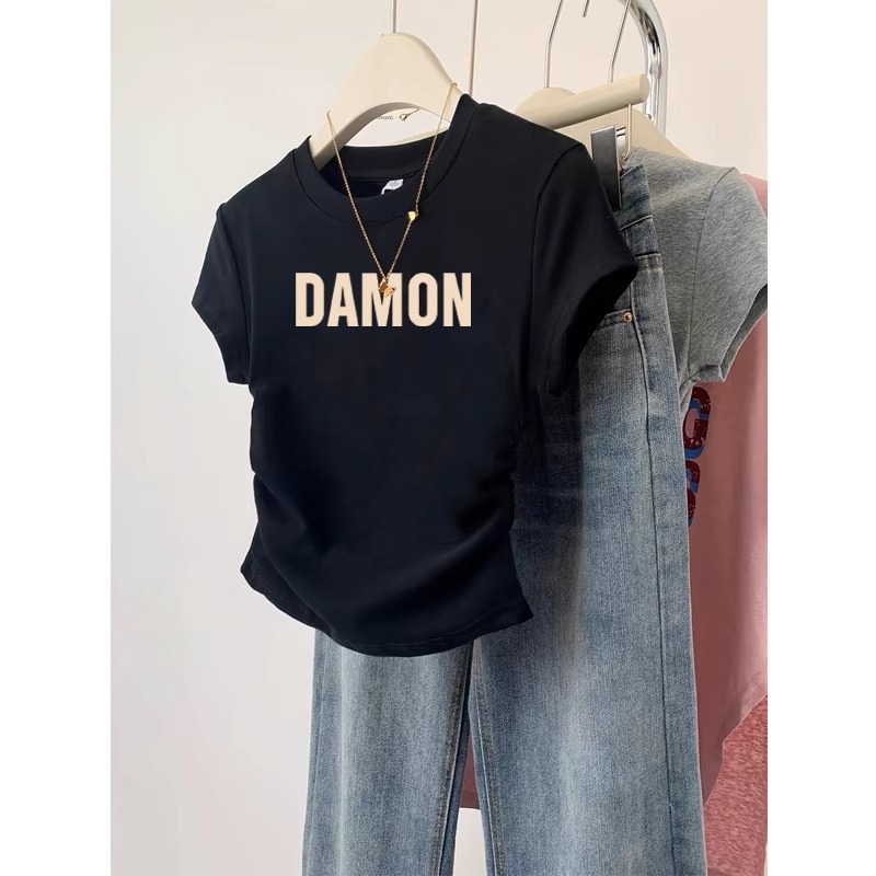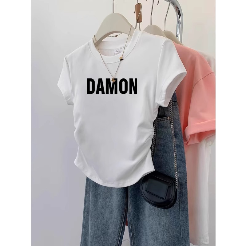 통통한 소녀를위한 짧은 어깨가 달린 반팔 섹시한 여성용 티셔츠 니치 레터 탑 슬림 모양의 육체 커버 프린트 라운드 넥 화이트 티셔츠스토어 가기