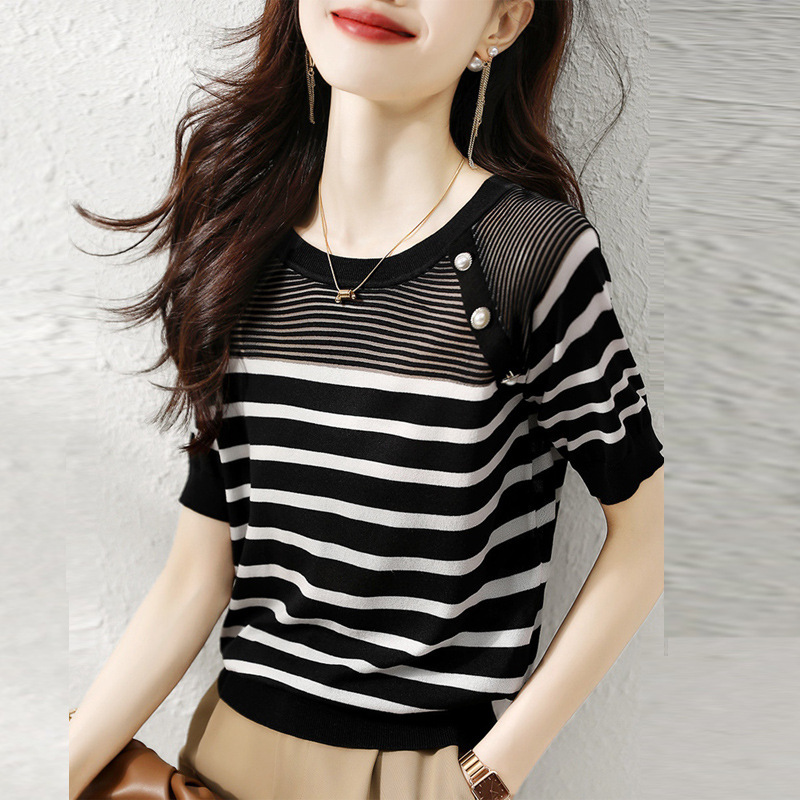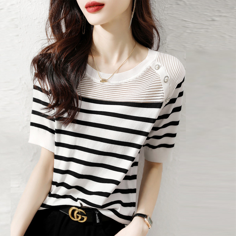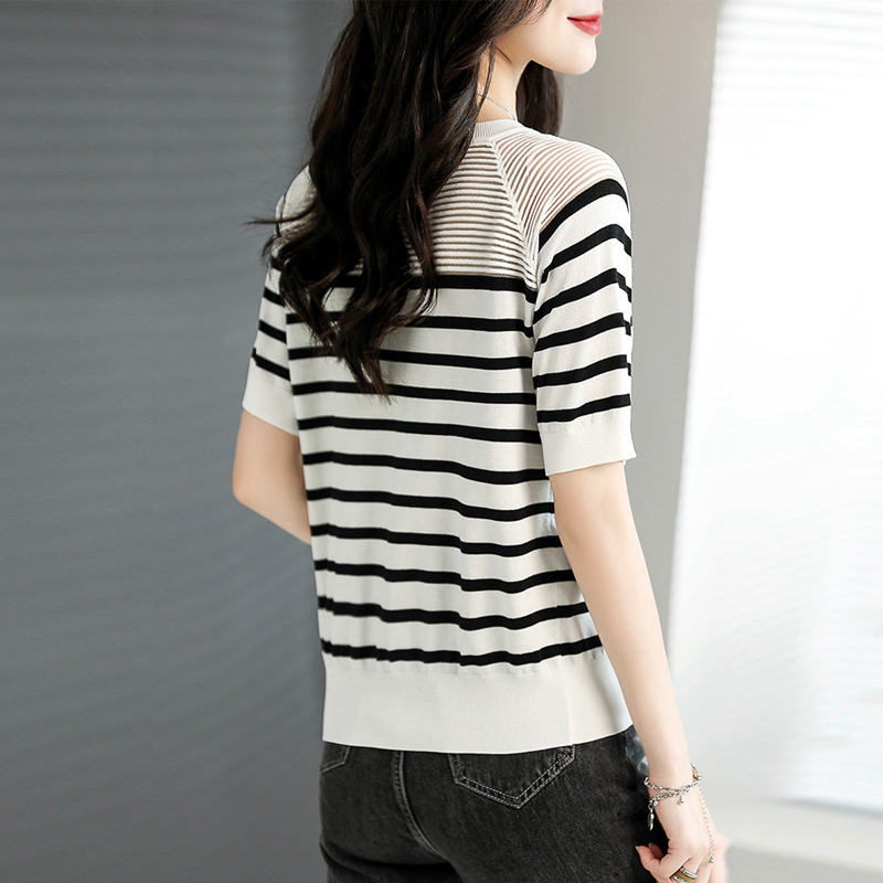 반팔 줄무늬 스웨터 여성 여름 새로운 한국식 우아한 슬리밍 연령 감소 셔츠 둥근 목 아이스 실크 탑 옷스토어 가기