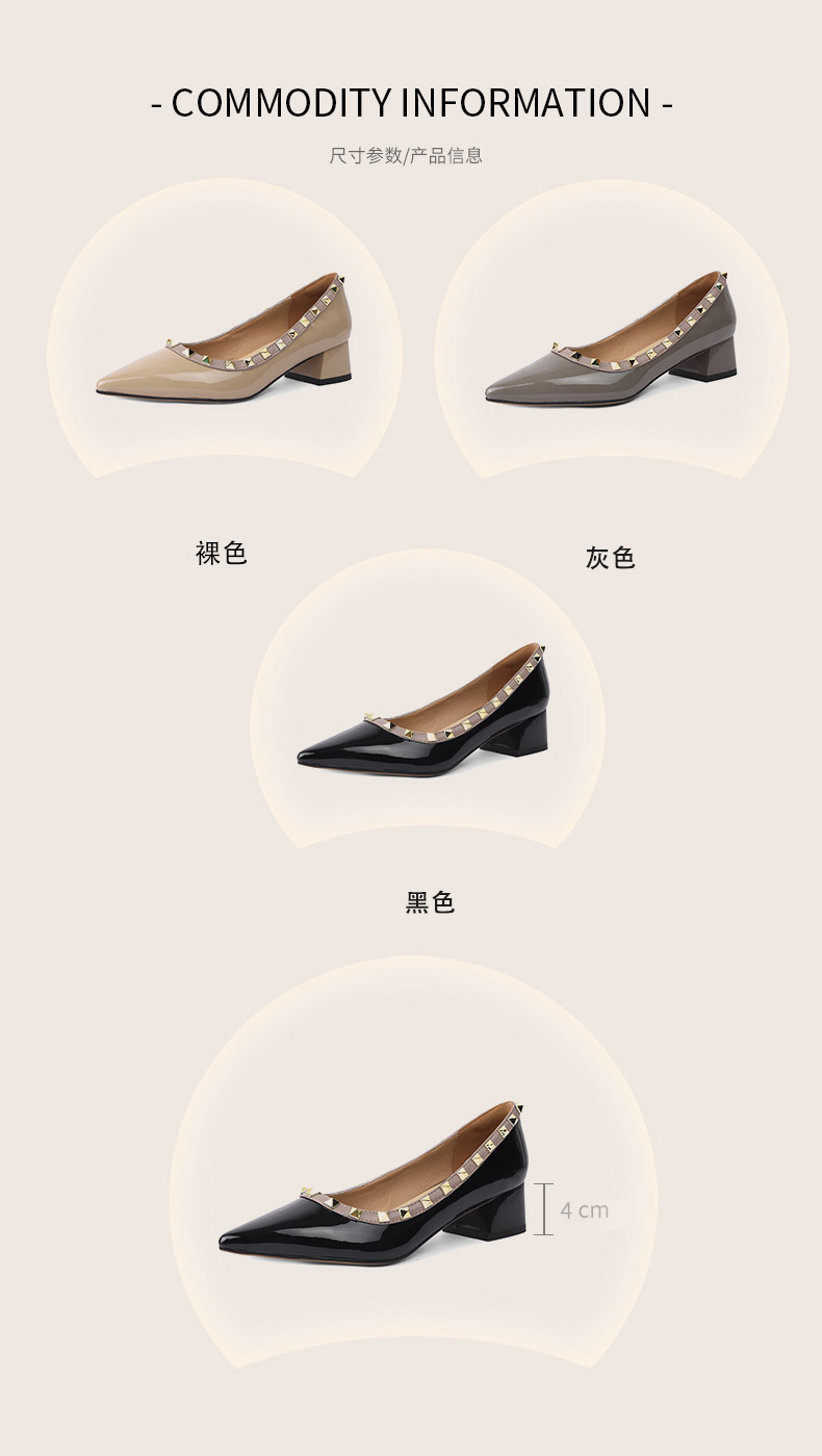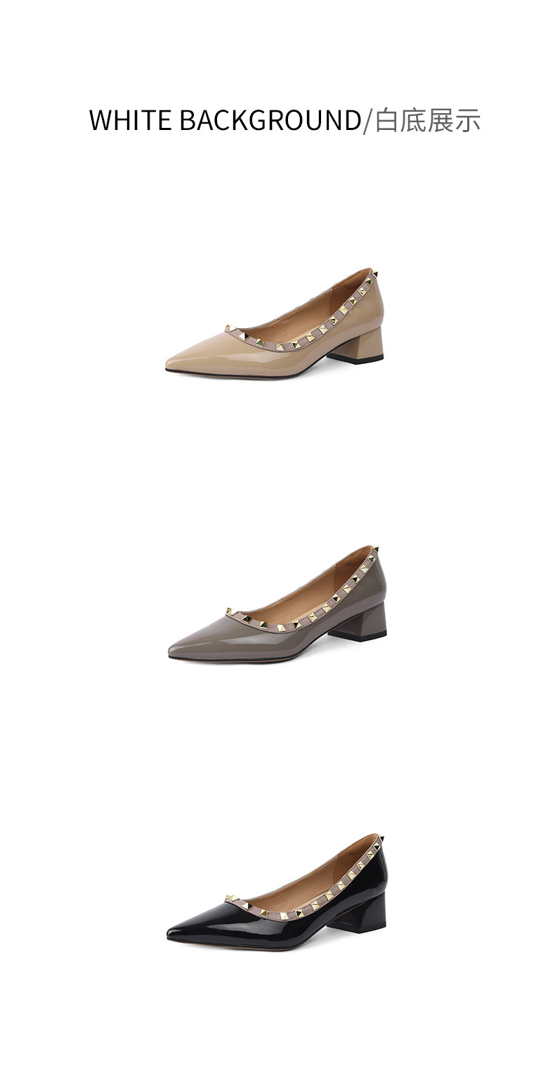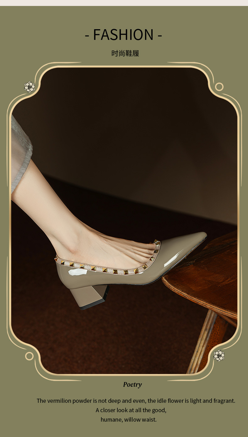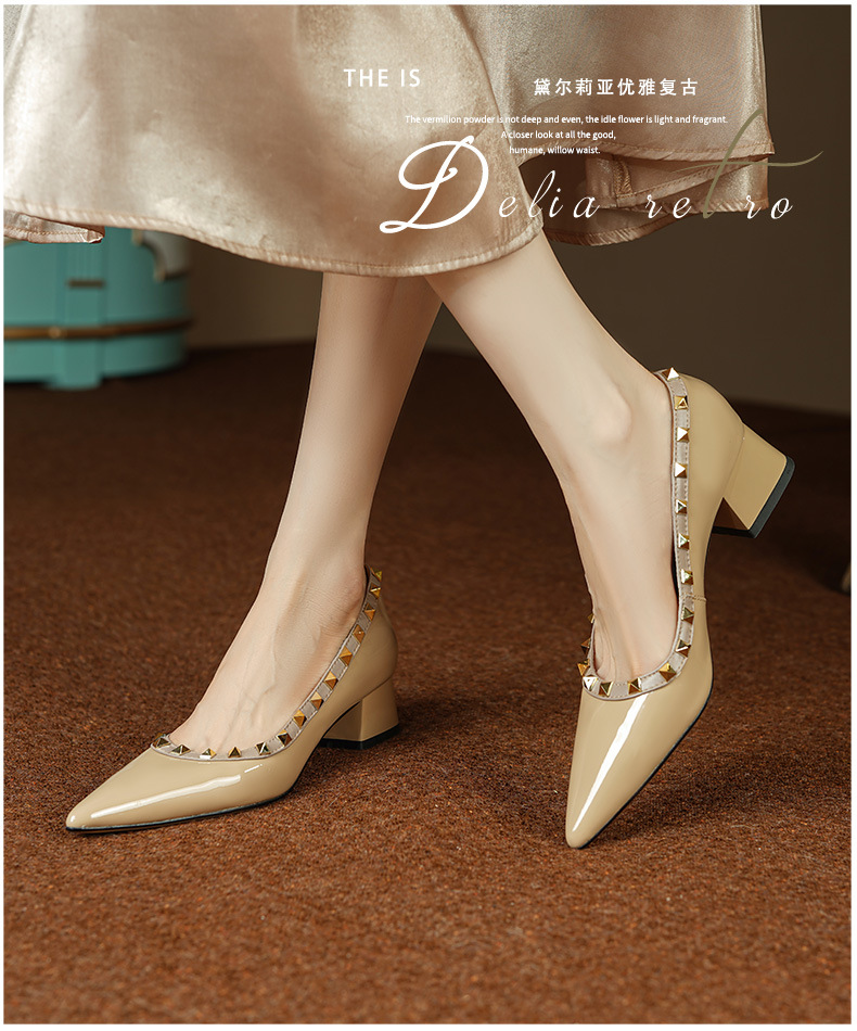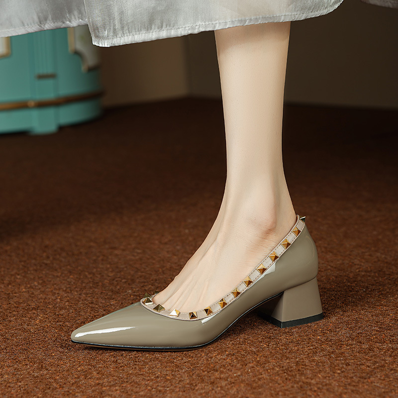 빈티지 정품 가죽 리벳 얕은 미드 힐 싱글 레이어 신발 2024 봄과 가을 새로운 Cowhide 두꺼운 뒤꿈치 포인팅 특허 가죽 올 매치 여성 신발스토어 가기