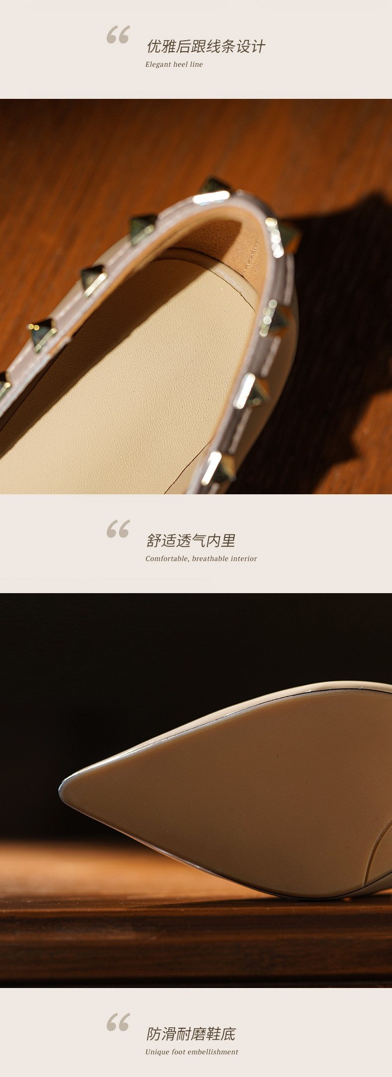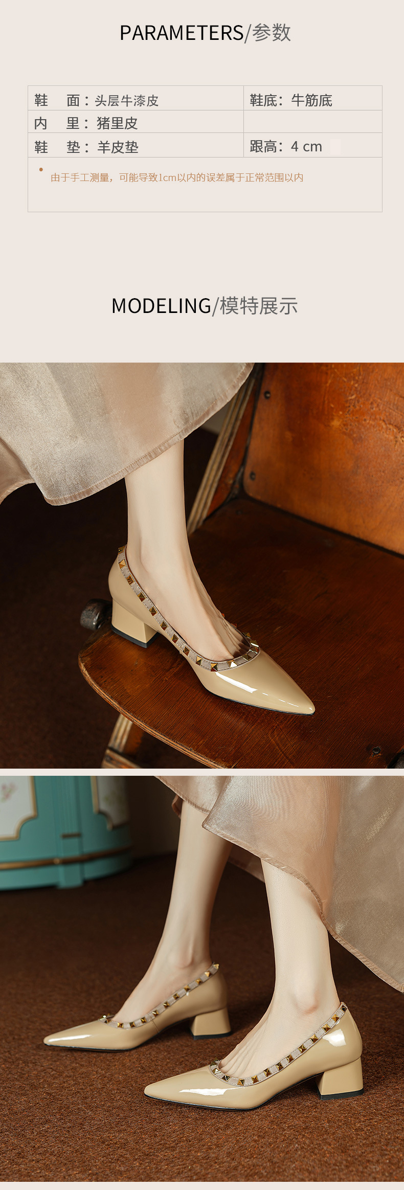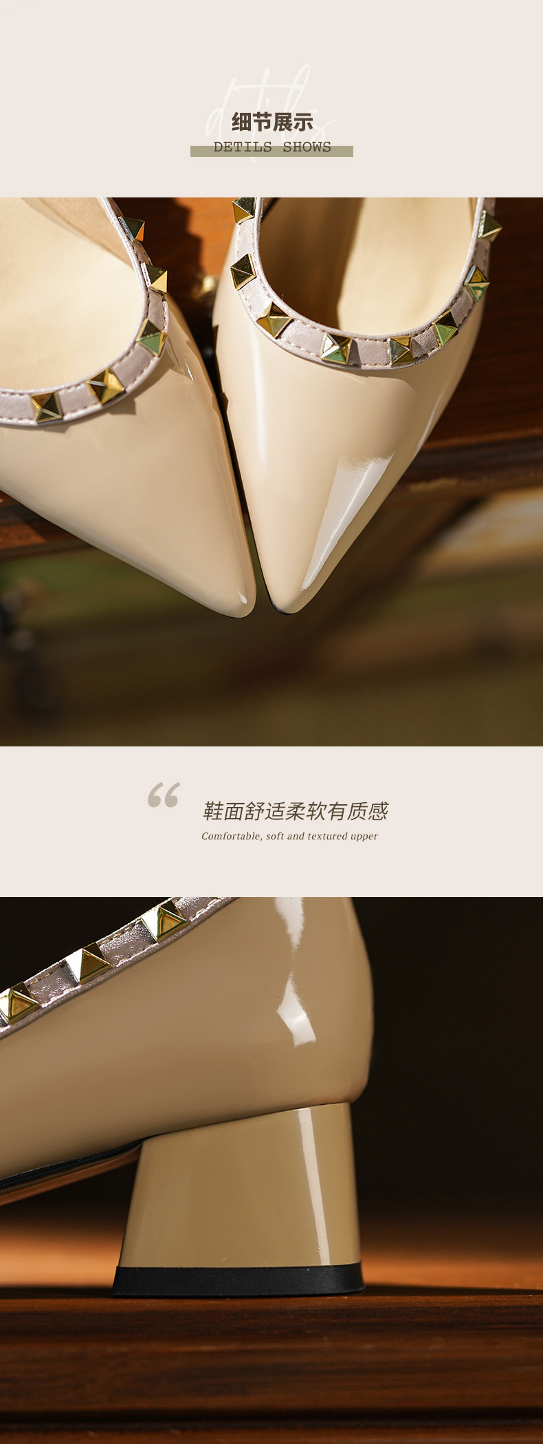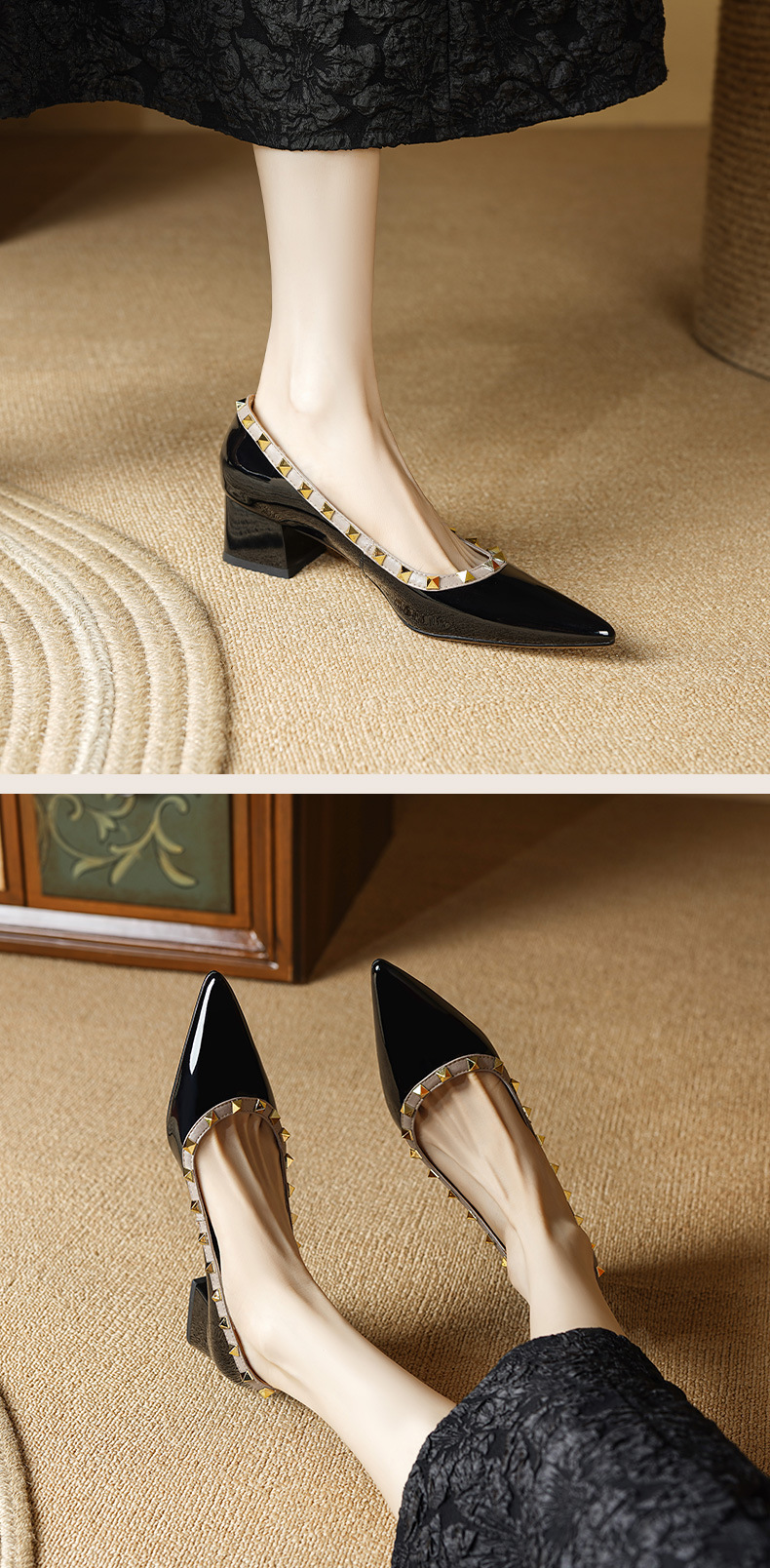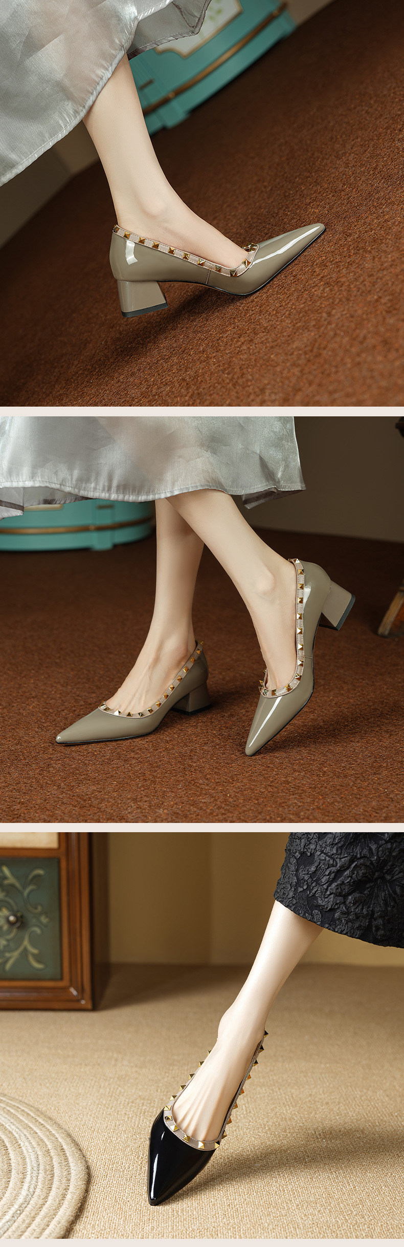 빈티지 정품 가죽 리벳 얕은 미드 힐 싱글 레이어 신발 2024 봄과 가을 새로운 Cowhide 두꺼운 뒤꿈치 포인팅 특허 가죽 올 매치 여성 신발스토어 가기