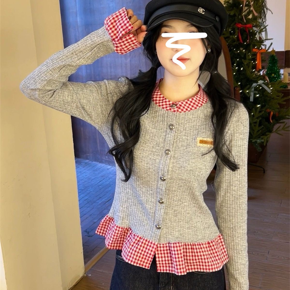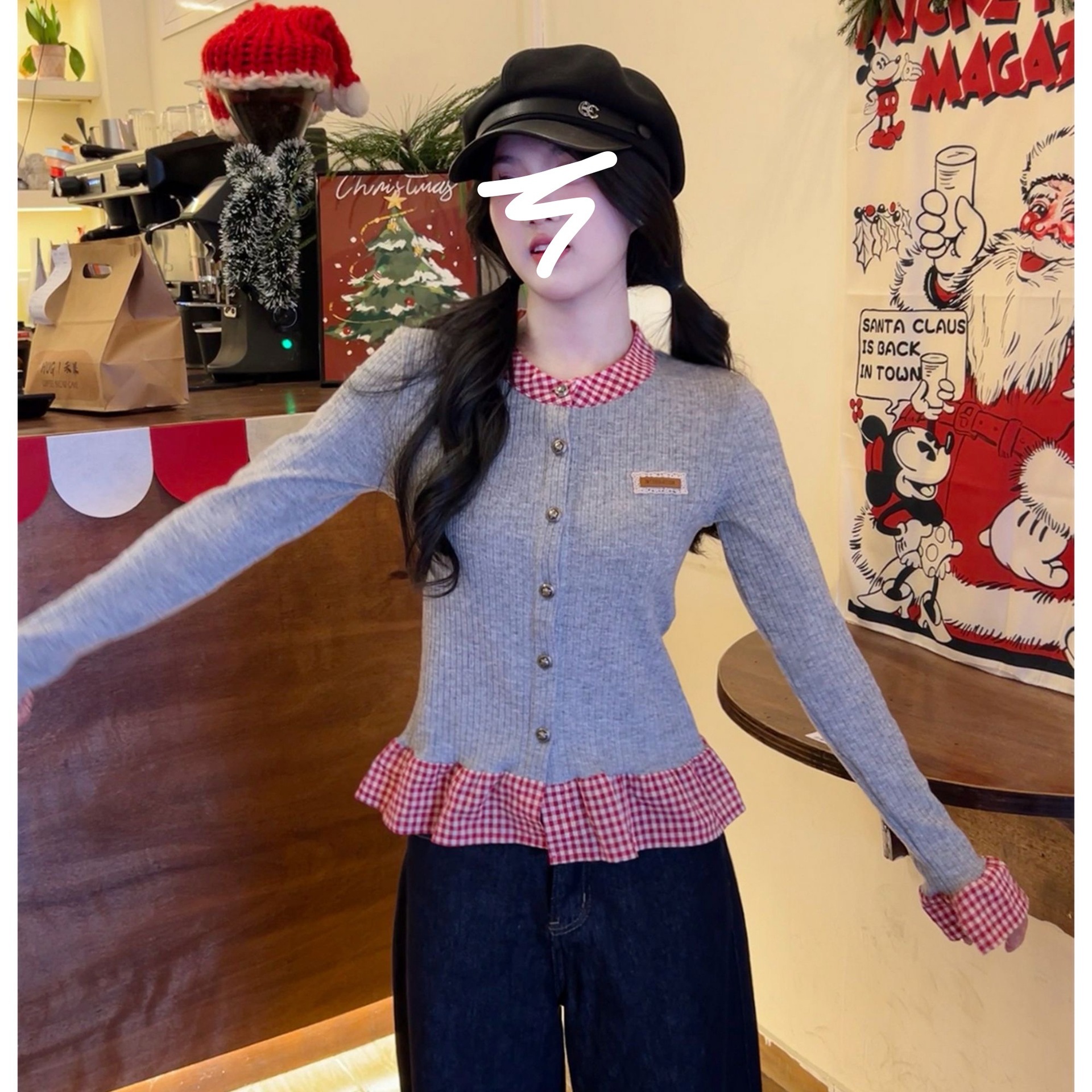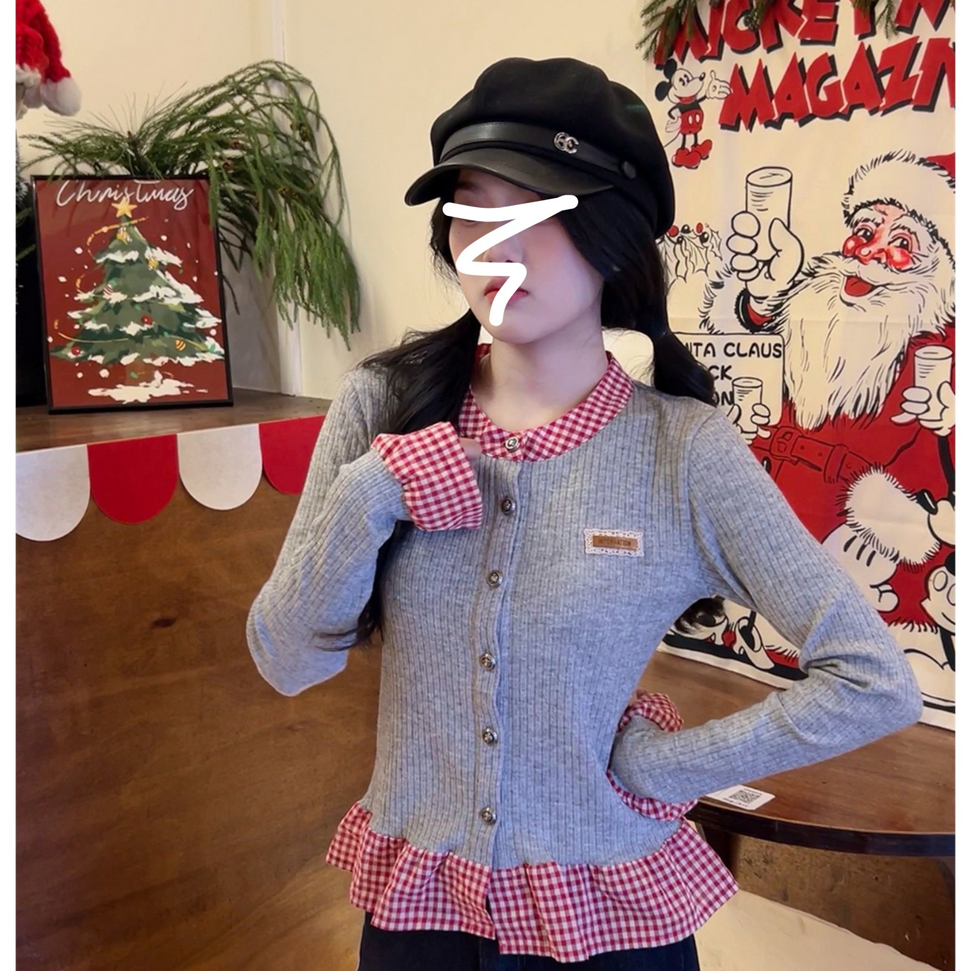앰비언스 격자 바느질 가짜 투피스 긴팔 니트 스웨터 여자 한국식 슬림핏 올매치 톱 2025 이른 봄 뉴스토어 가기