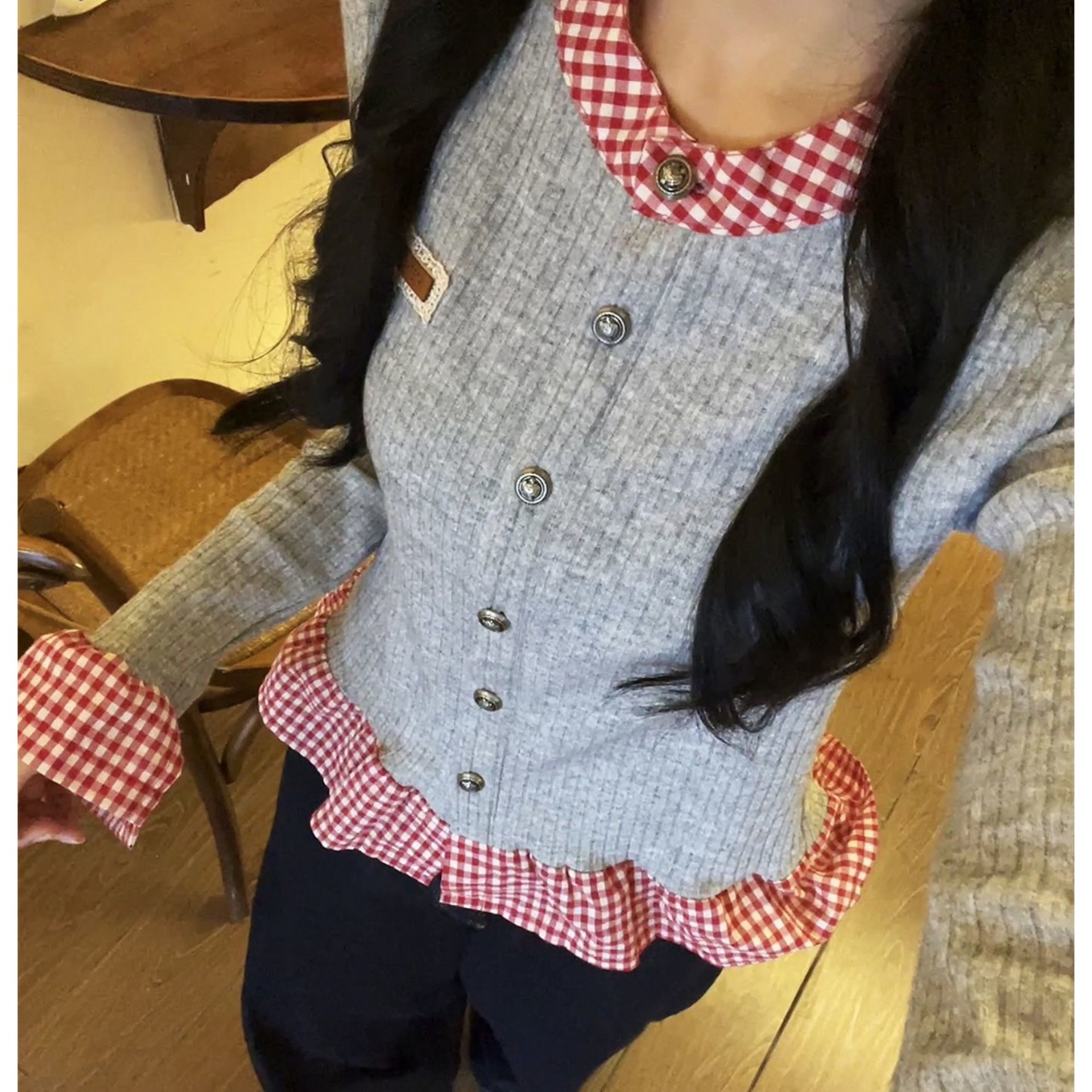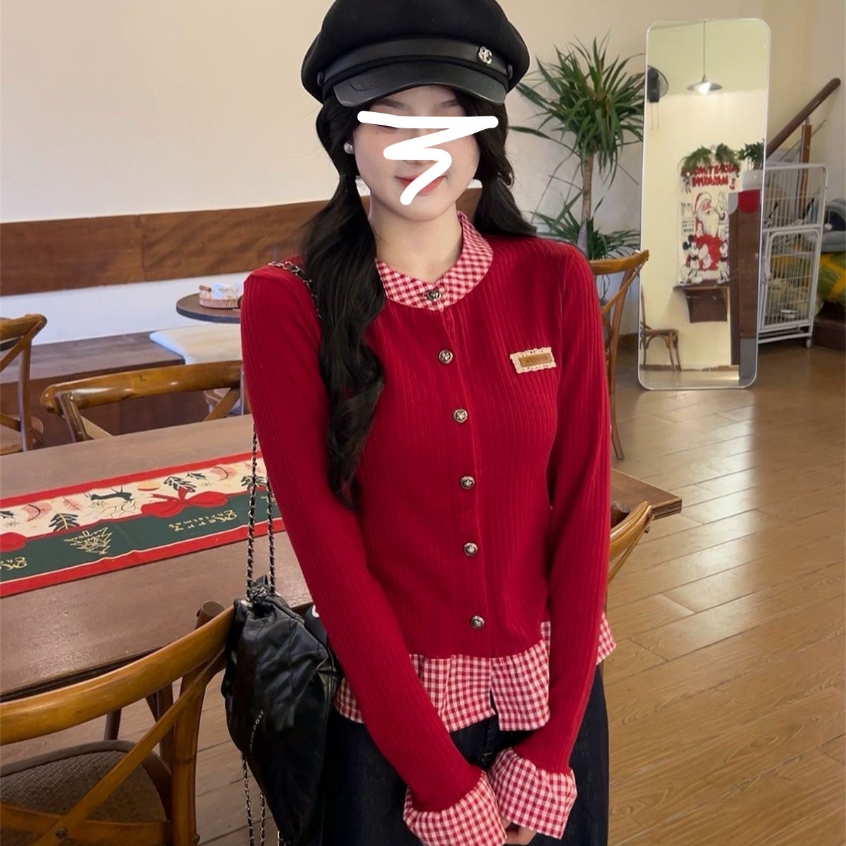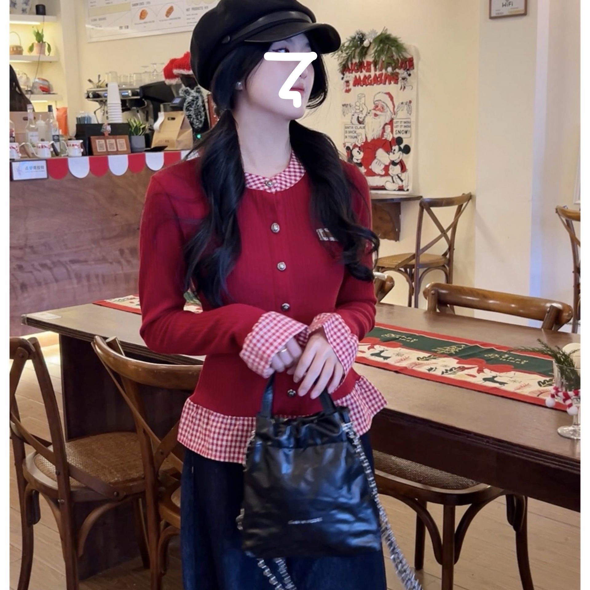 앰비언스 격자 바느질 가짜 투피스 긴팔 니트 스웨터 여자 한국식 슬림핏 올매치 톱 2025 이른 봄 뉴스토어 가기