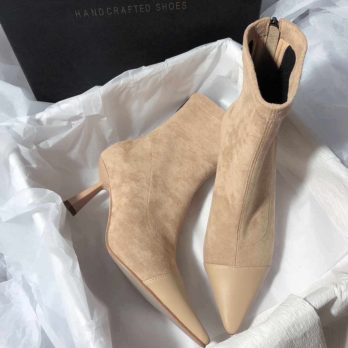 새로운 Senyu Hailiang 포인팅 하이힐 가죽 리어 지퍼 부츠 간단한 스티칭 우아한 하이힐 패션스토어 가기