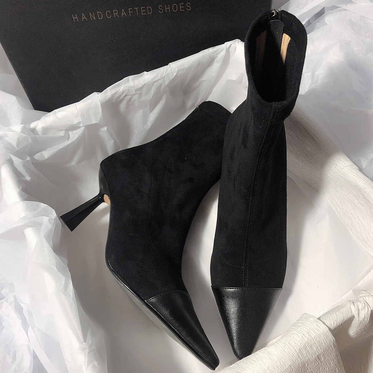 새로운 Senyu Hailiang 포인팅 하이힐 가죽 리어 지퍼 부츠 간단한 스티칭 우아한 하이힐 패션