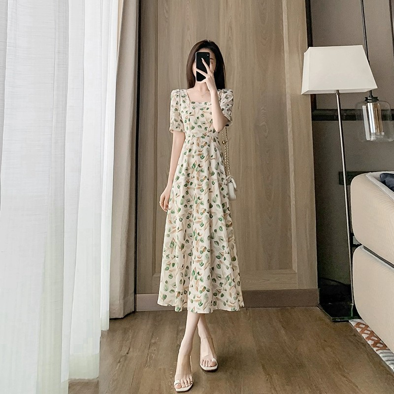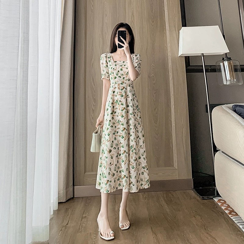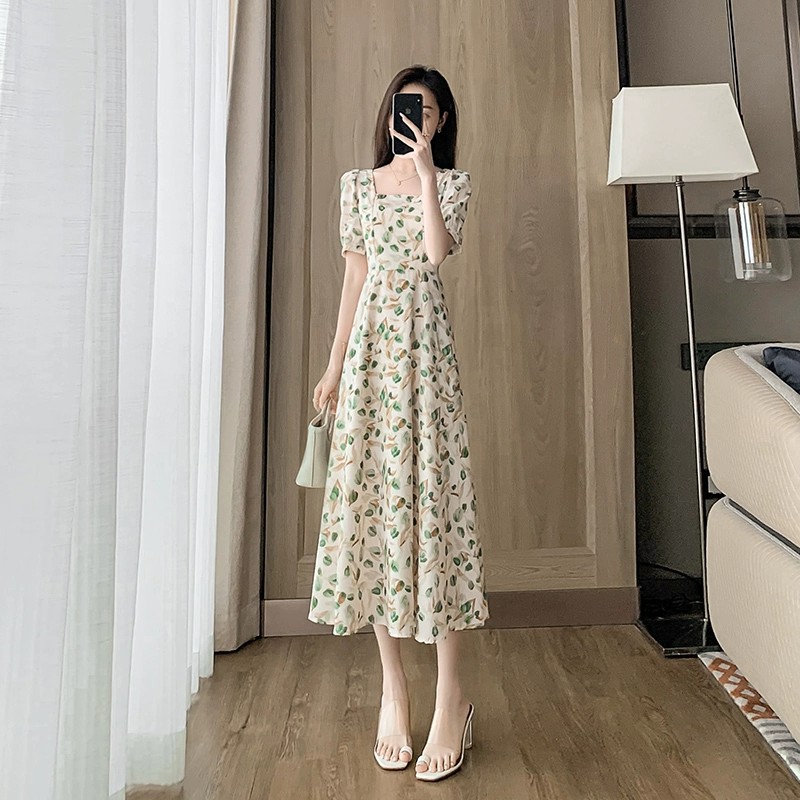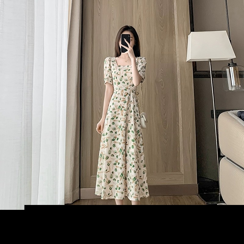 티 브레이크 프렌치 쉬폰 플로랄 원피스 여성 2025 년 새 여름 우아한 스퀘어 칼라 허리 슬림 A 라인 스커트