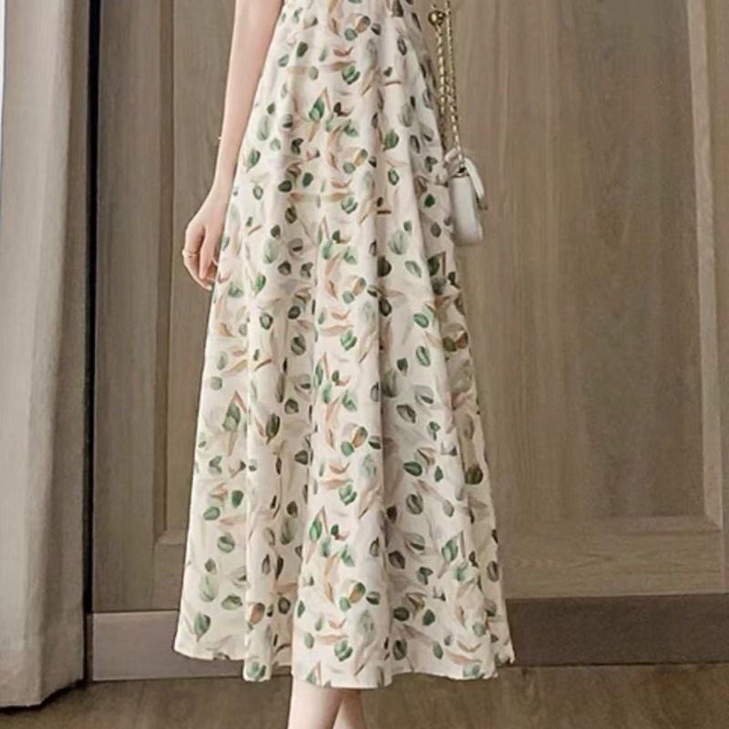 티 브레이크 프렌치 쉬폰 플로랄 원피스 여성 2025 년 새 여름 우아한 스퀘어 칼라 허리 슬림 A 라인 스커트스토어 가기