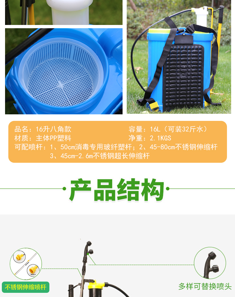 • 스테인레스 스틸 스프레이 로드가 포함된 16리터 팔각형 모델