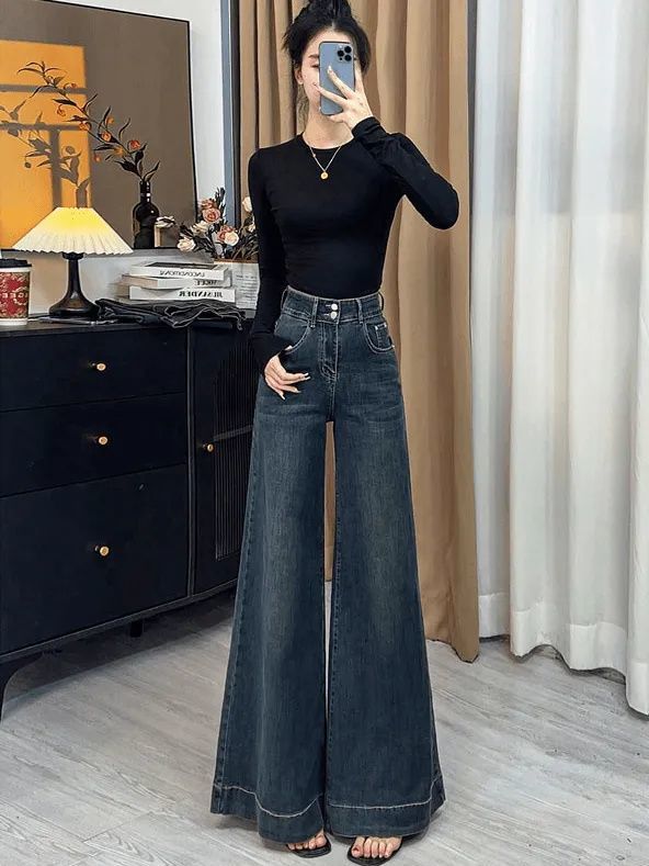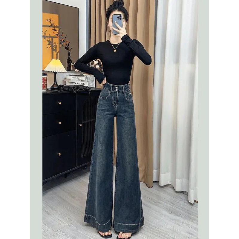 다크 블루 빈티지 스트레이트 마이크로 혼 청바지 여성의 2025 새로운 가을 느슨한 슬림 넓은 다리 바지스토어 가기