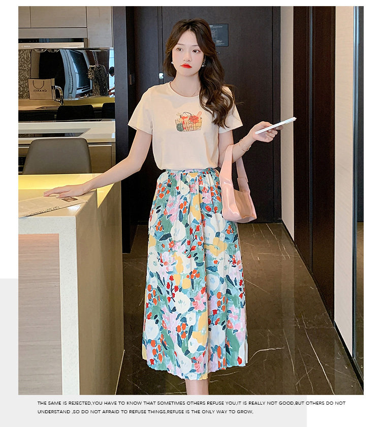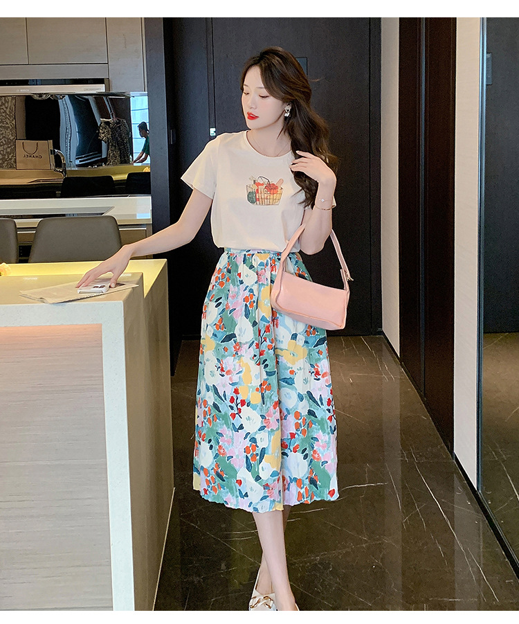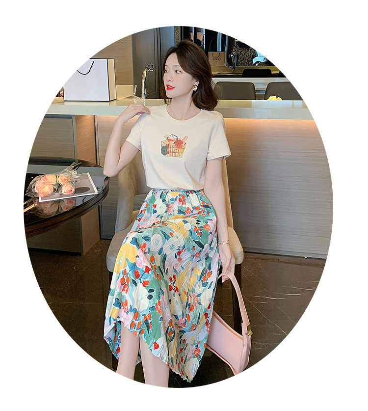 2025 새로운 여름 투피스 쉬폰 프린트 티셔츠/유화 스커트 여성 여름 리틀 A 라인 스커트