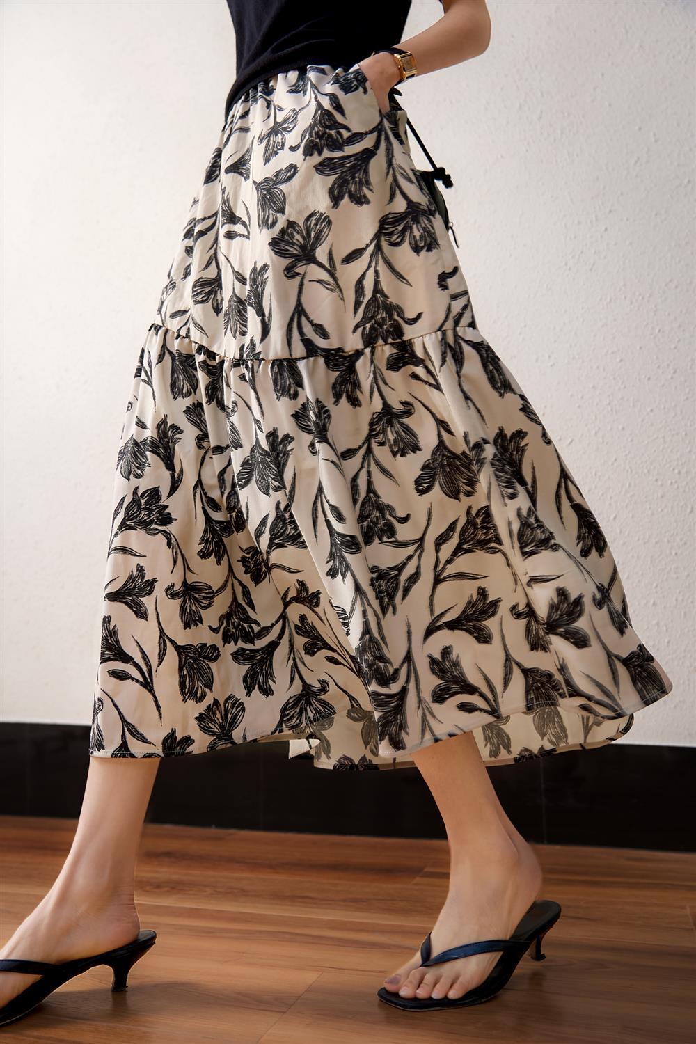 2025 여름 새로운 여성의 하이 엔드 숨기기 살포 느슨한 허리 슬림 A 라인 인쇄 여성을위한 중간 길이의 대형 스윙 스커트스토어 가기