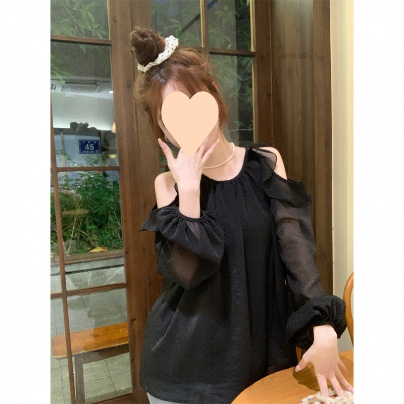 한국 스타일 달콤한 소녀 여성의 봄 쉬폰 셔츠 러플 연령 감소 오픈 숄더 넥 조커 탑