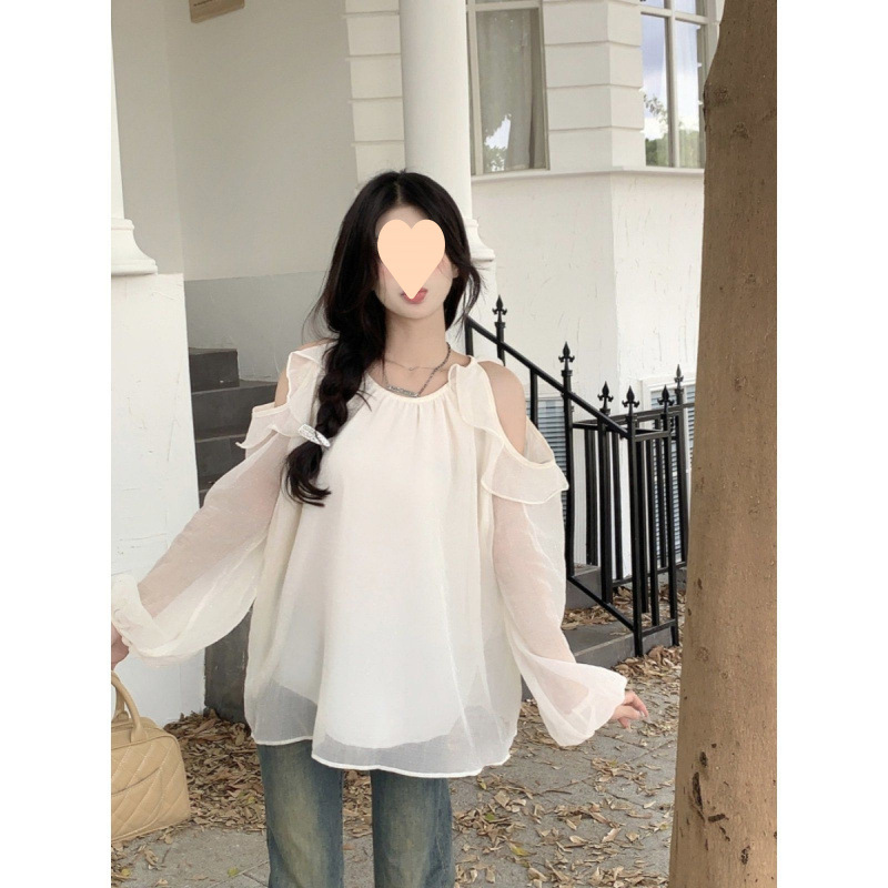 한국 스타일 달콤한 소녀 여성의 봄 쉬폰 셔츠 러플 연령 감소 오픈 숄더 넥 조커 탑스토어 가기