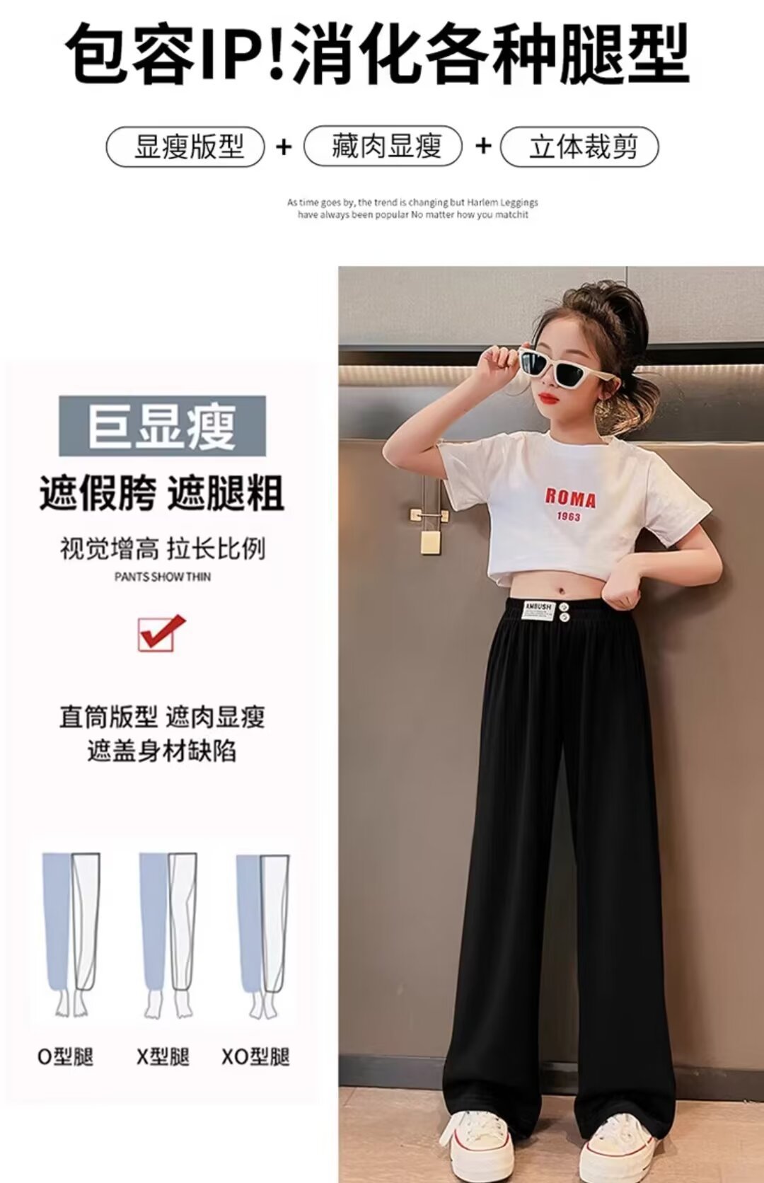소녀 바지 2025 새로운 어린이 서양식 얇은 아이스 실크 바지 소녀 스트레이트 바지 소녀 캐주얼 와이드 다리 바지