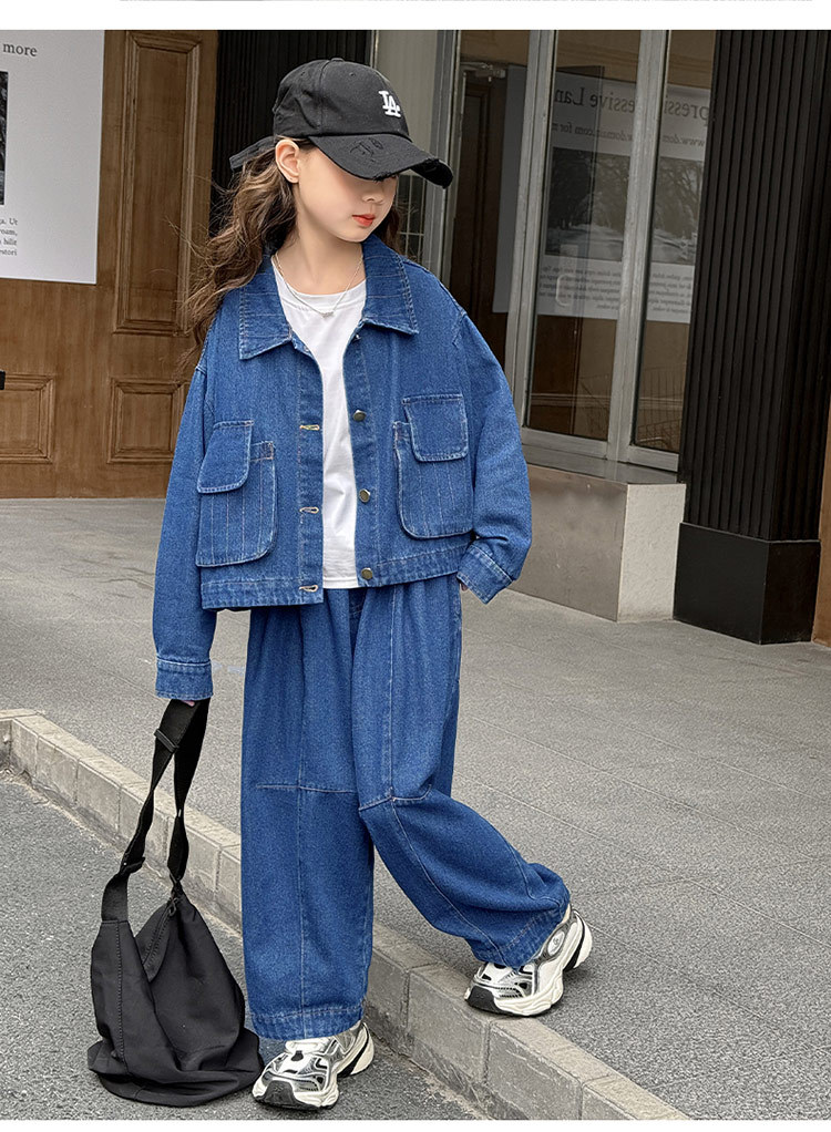 소녀 데님 세트 2025 봄과 가을 새로운 어린이 패션 국경 간 작업복 재킷 청바지 투피스 세트