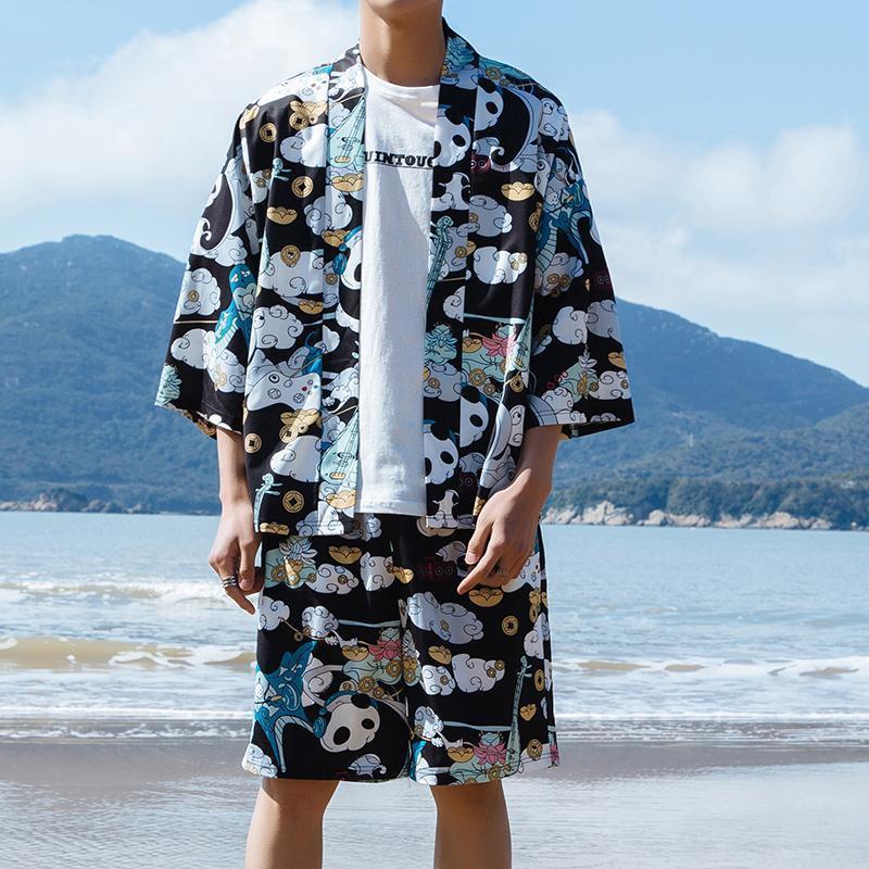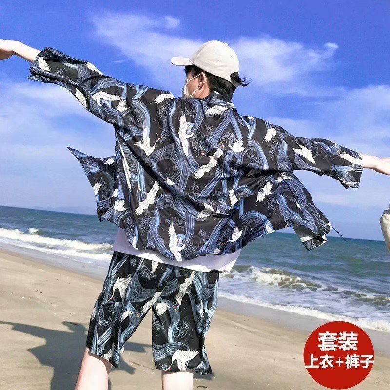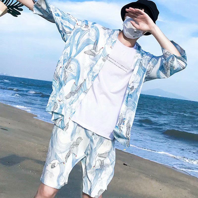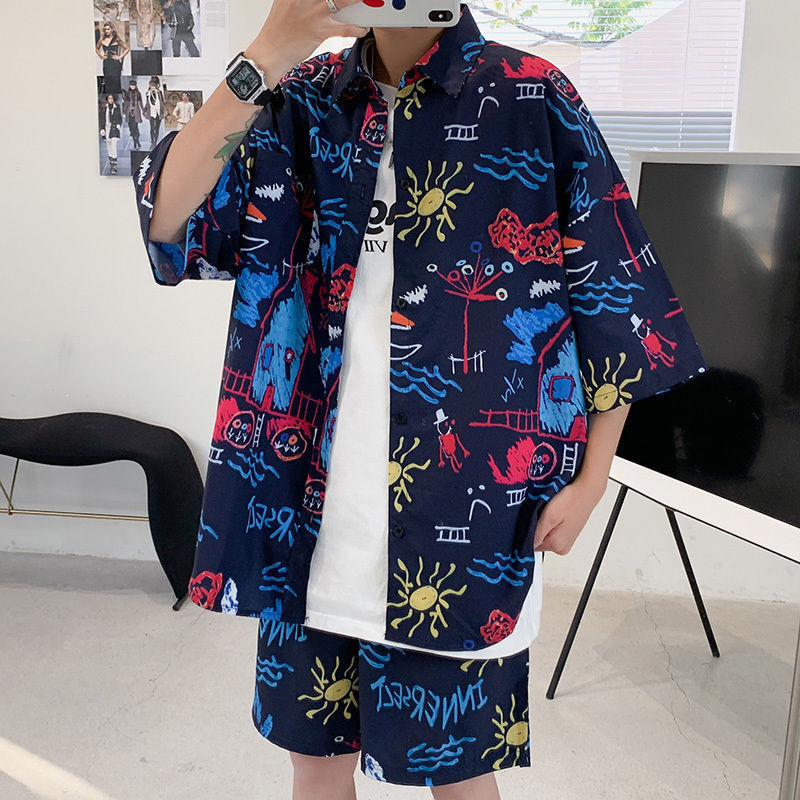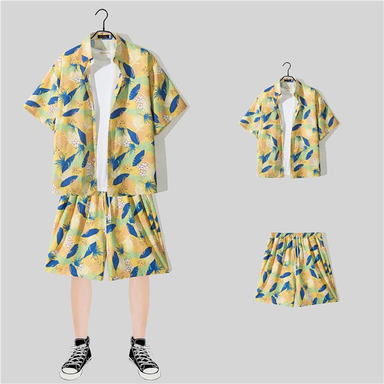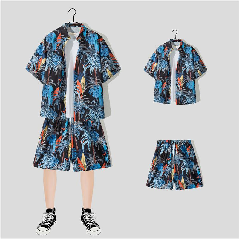 꽃 셔츠 반바지 인기있는 하라주쿠 일본식 하와이 캐주얼 세트 게으른 여름 유행 소녀와 소년 해변스토어 가기