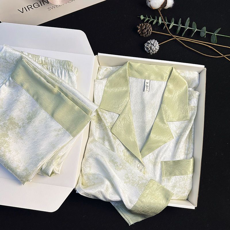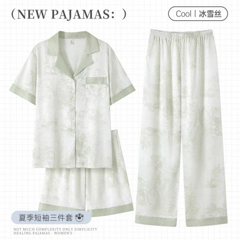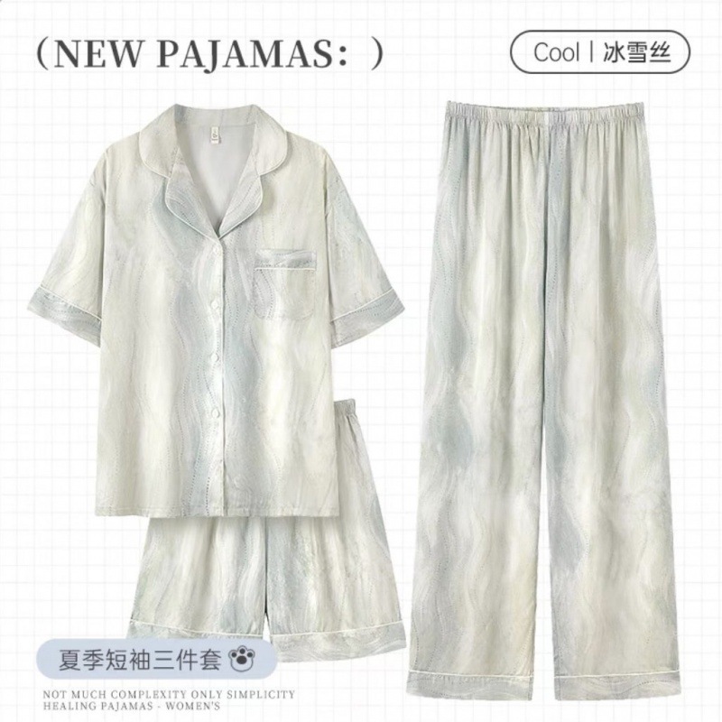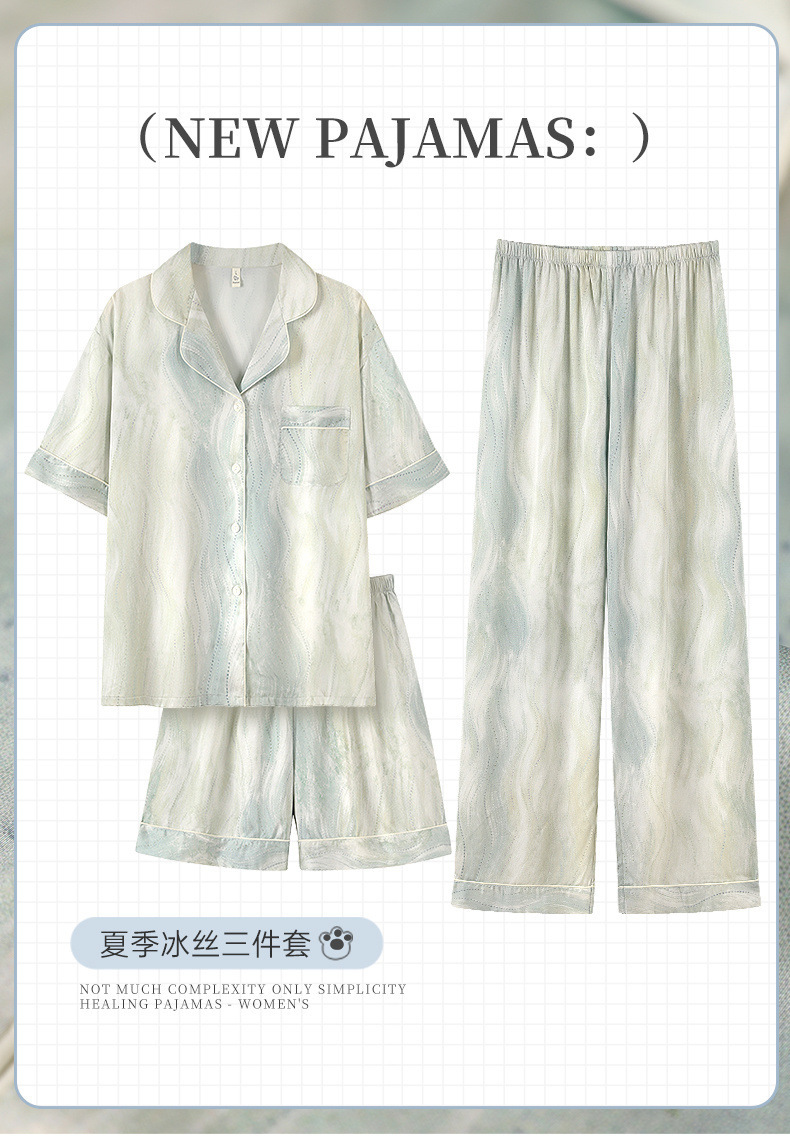 3 피스 잠옷 여성 여름 하이 엔드 아이스 실크 반팔 바지 2024 여름 새 플러스 사이즈 홈 옷스토어 가기
