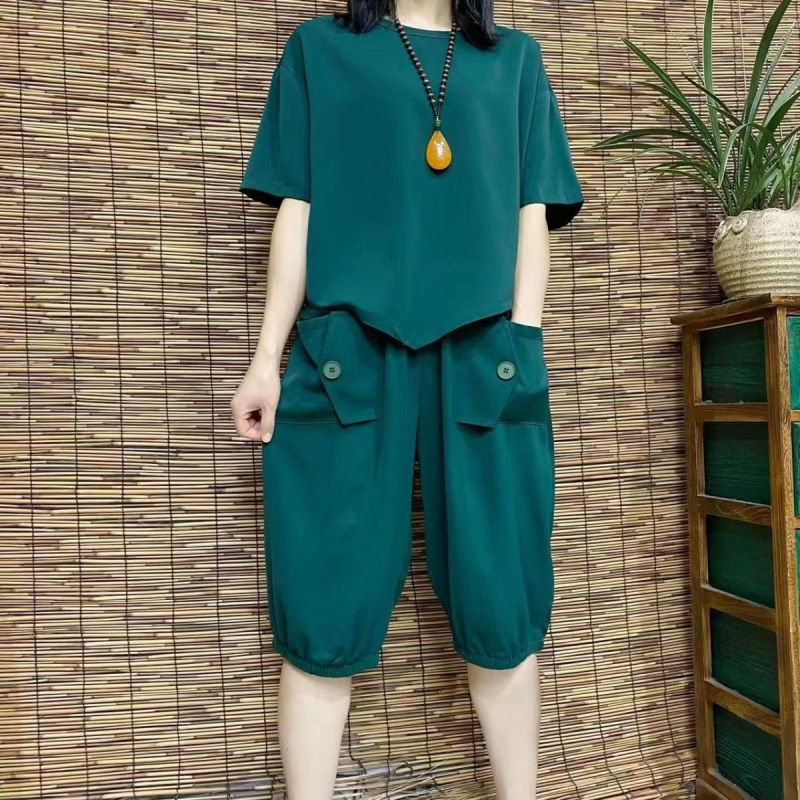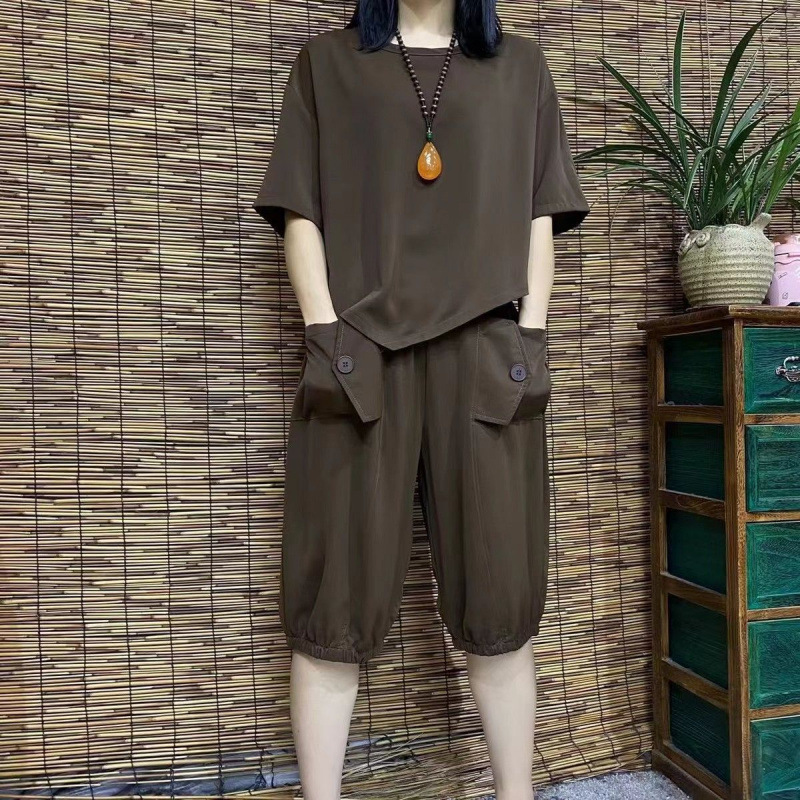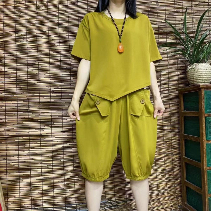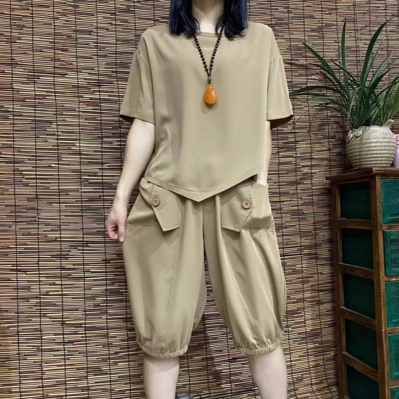 여름 아이스 실크 자른 바지 세트 여성 패션 루스 슬리밍 올 매치 쇼트 슬리브 탑 투피스 세트