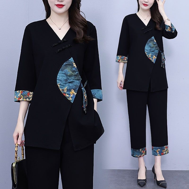 새로운 중국 스타일 빈티지 국가 스타일 유행 세트 여성 여름 느슨한 플러스 사이즈 여성용 복 복부를 덮는 프린트 슬림 룩 2 피스 유행 세트