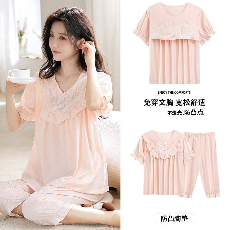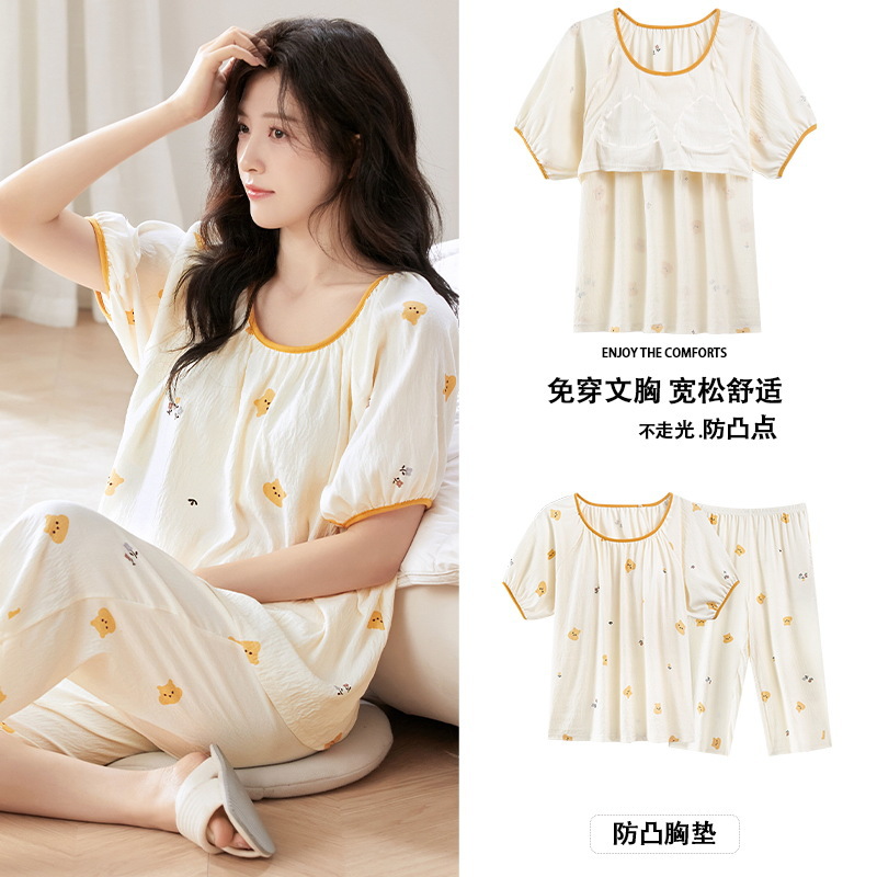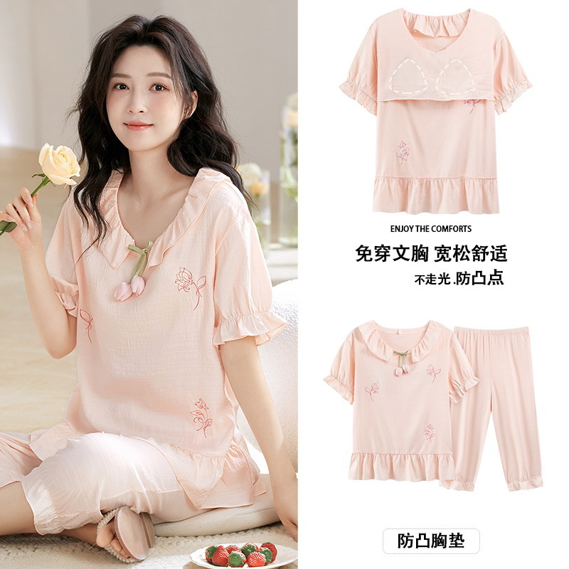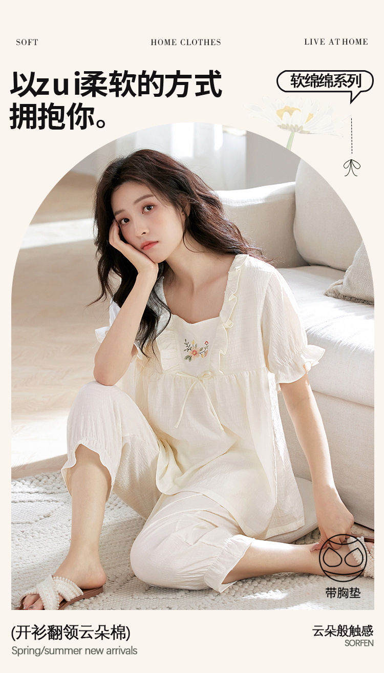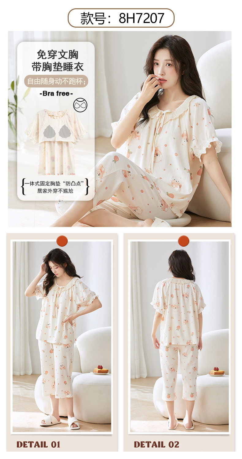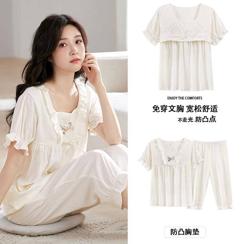 클라우드 코튼 반팔 자른 바지 파자마 여성 여름 달콤한 공주 스타일 가슴 패드 홈 옷 여성 캐주얼 잠옷스토어 가기