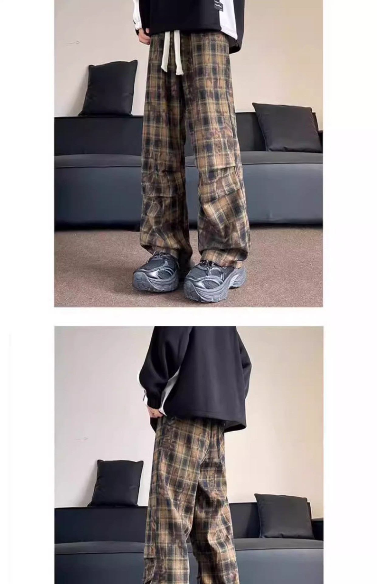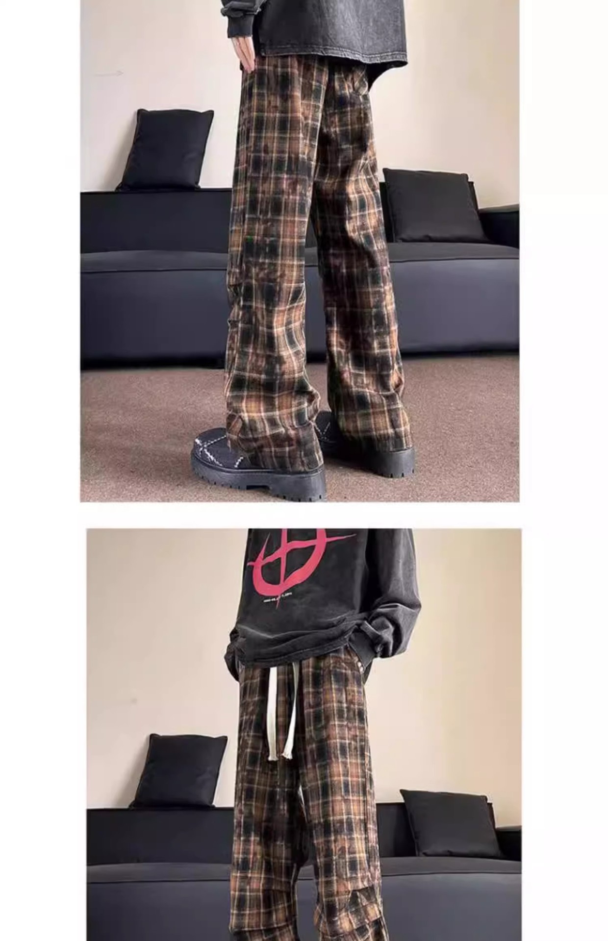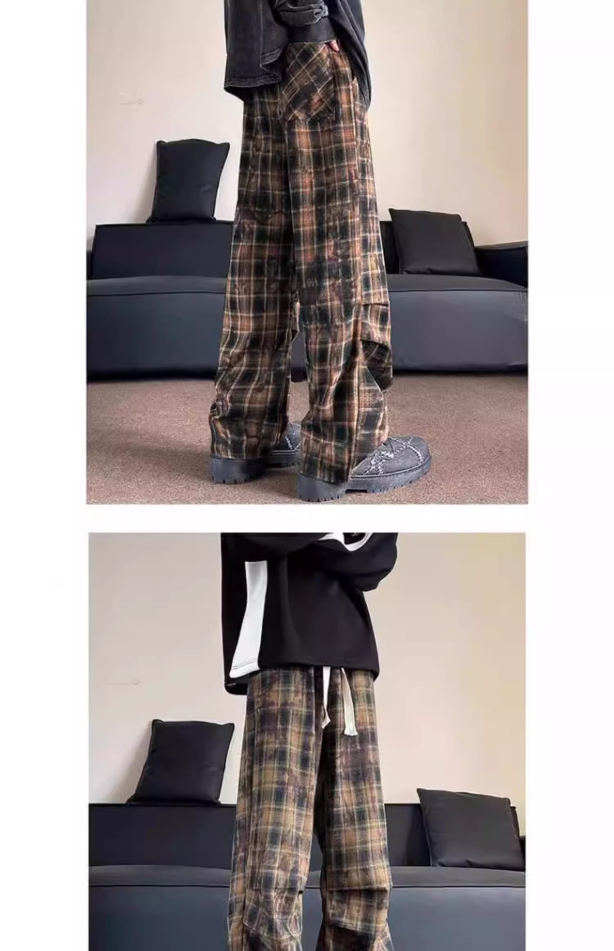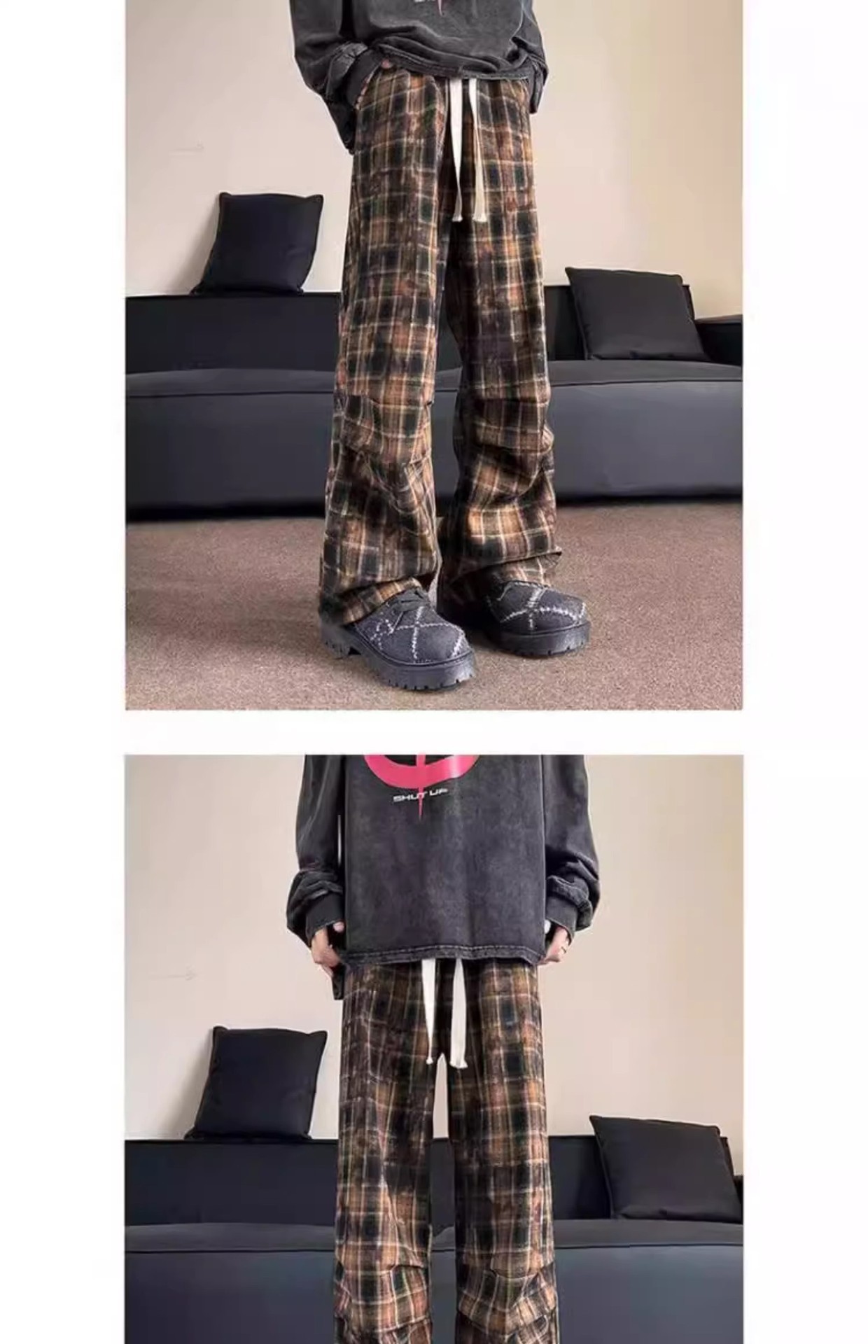 미국 스타일 복고풍 격자 무늬 캐주얼 바지 오버 사이즈 데프 스트레이트 바지 남성 가을 패션 브랜드 느슨한 넓은 다리 바지스토어 가기