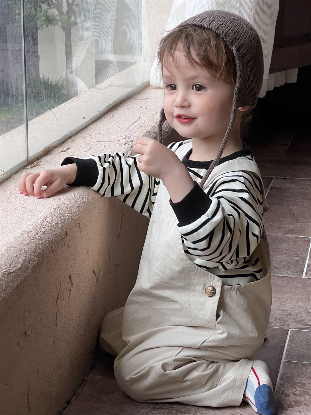 아기 가을옷 2025 가을 신상품 한국 스타일 아동복 남아 스트라이프 스웨트셔츠와 멜빵바지 세트스토어 가기