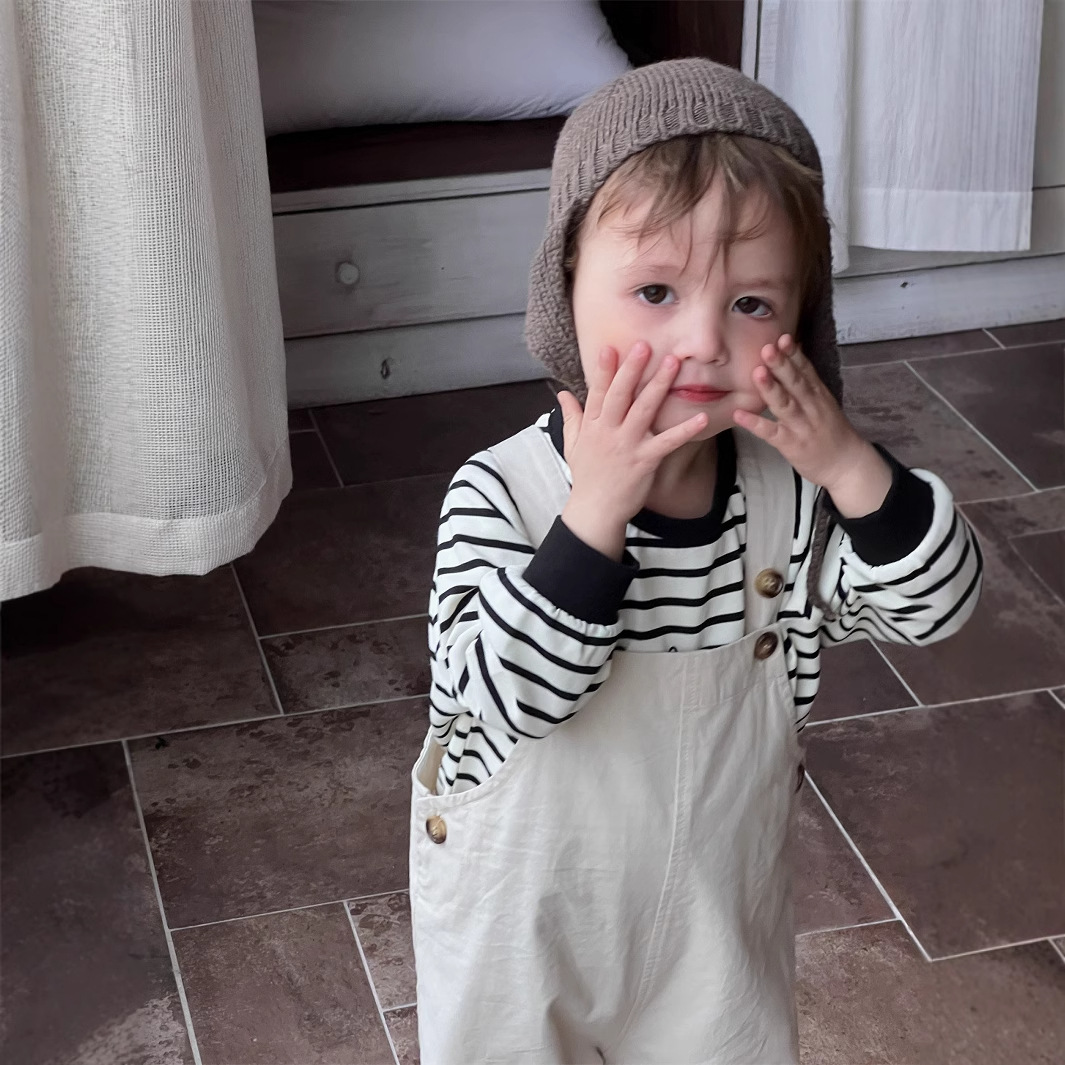 아기 가을옷 2025 가을 신상품 한국 스타일 아동복 남아 스트라이프 스웨트셔츠와 멜빵바지 세트