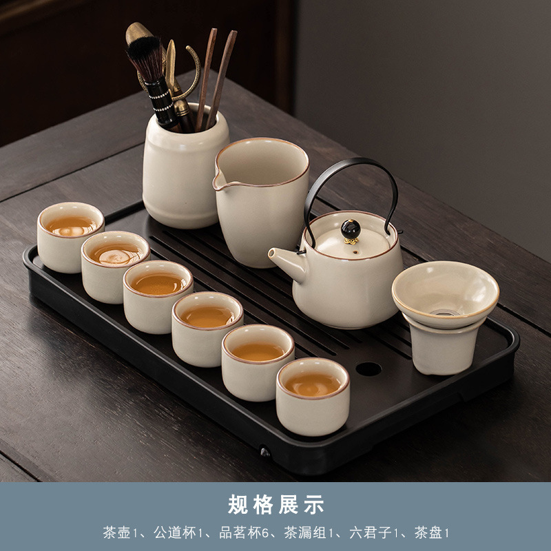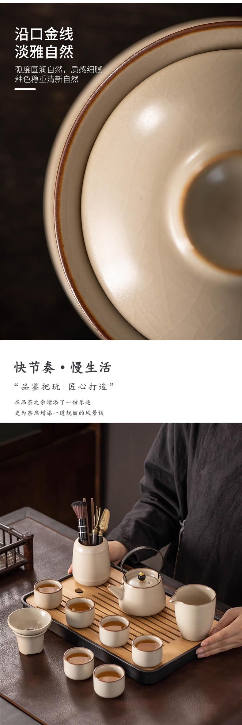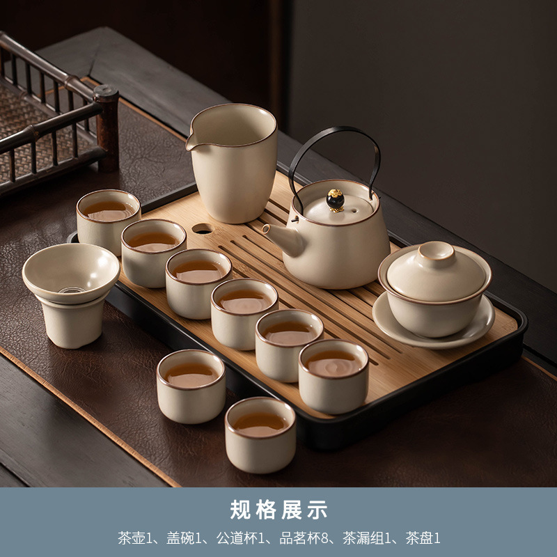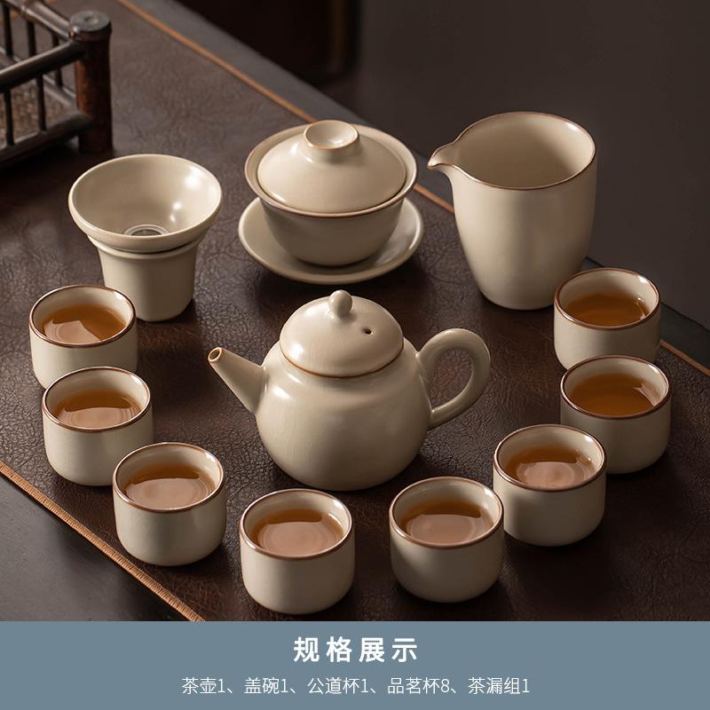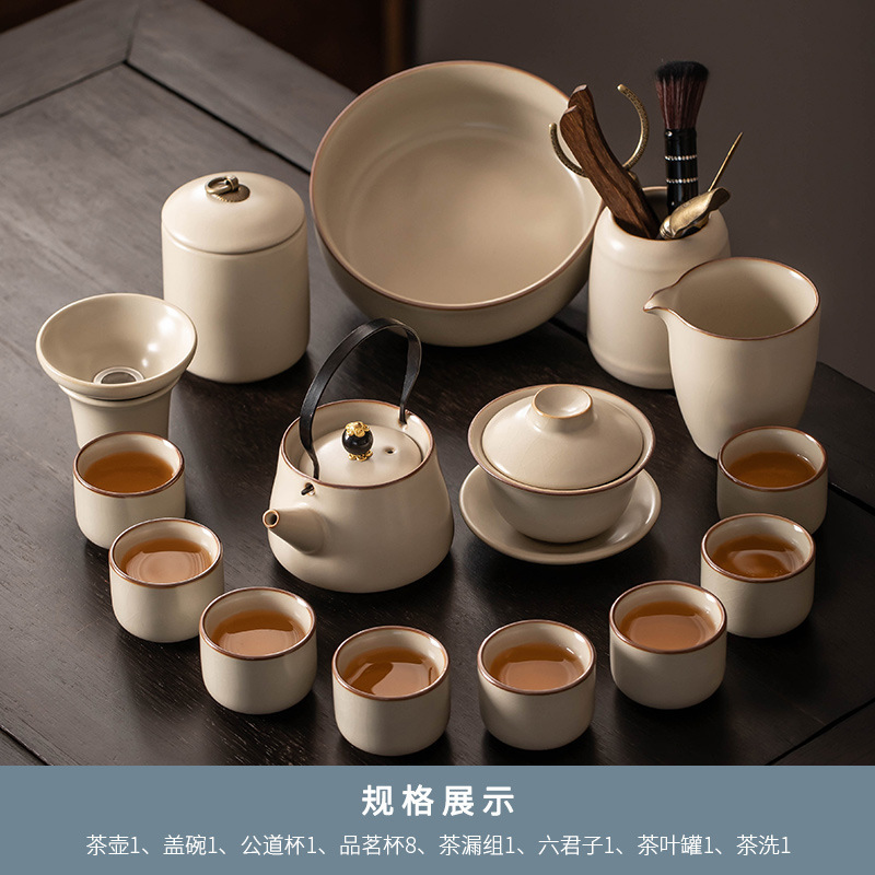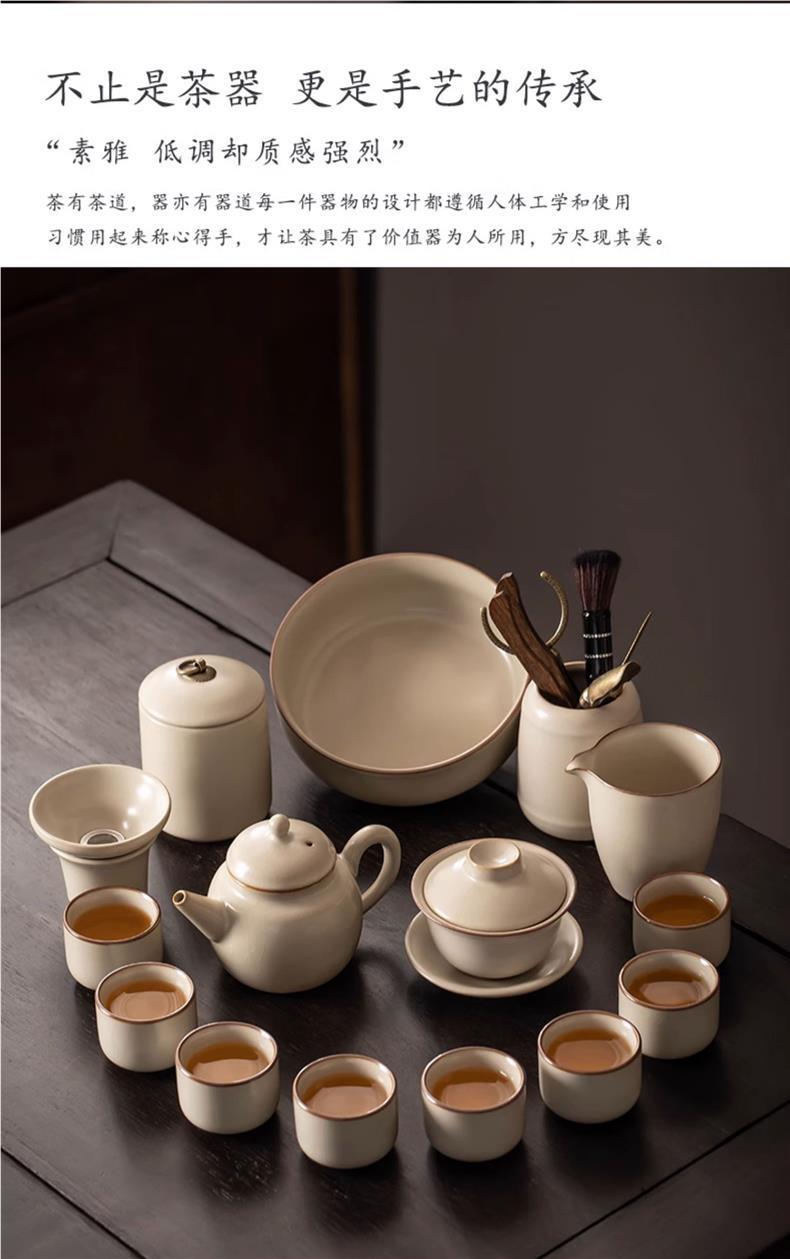 가벼운 고급 고급 차 마시는 중국 스타일 베이지 색 Ruyao 쿵푸 차 세트 세트 가정용 세라믹 주전자 커버 그릇 티 컵 티 트레이스토어 가기