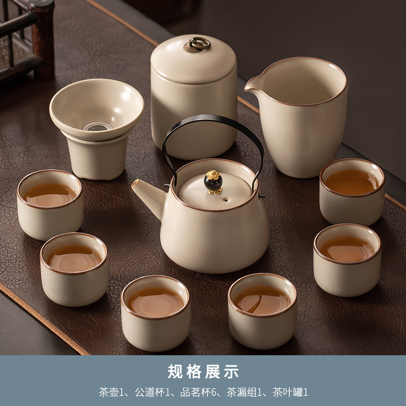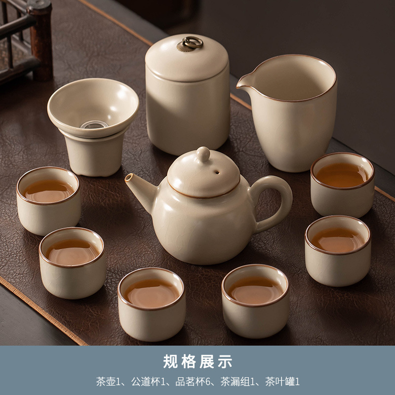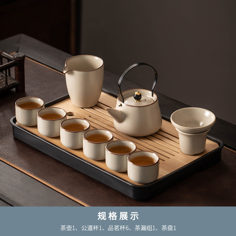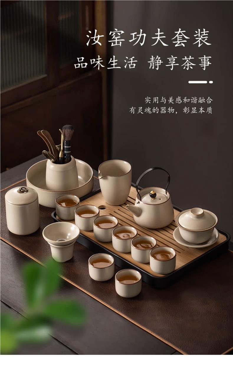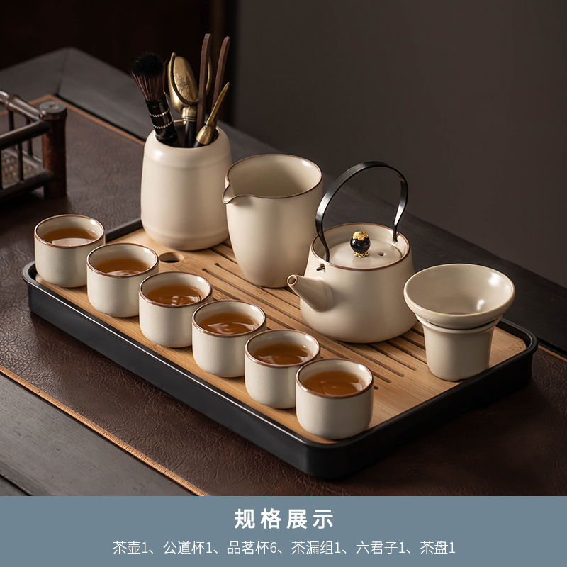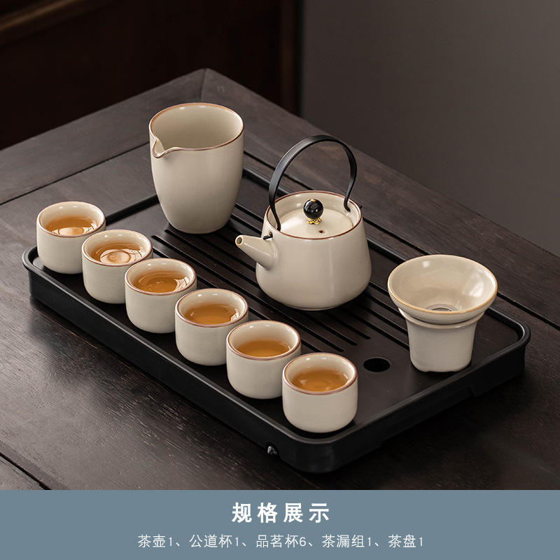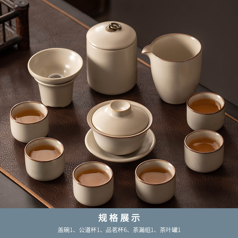 가벼운 고급 고급 차 마시는 중국 스타일 베이지 색 Ruyao 쿵푸 차 세트 세트 가정용 세라믹 주전자 커버 그릇 티 컵 티 트레이스토어 가기