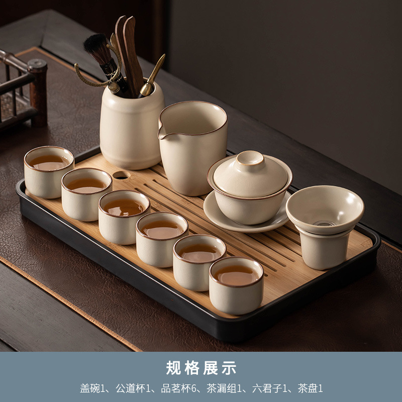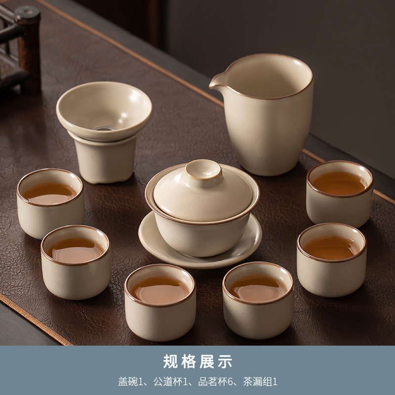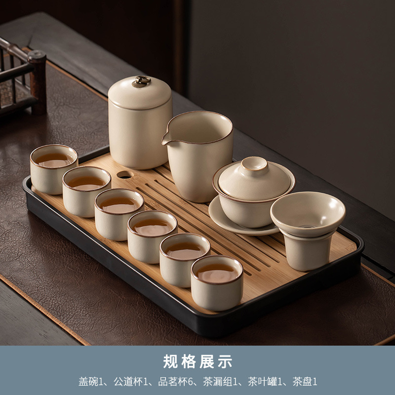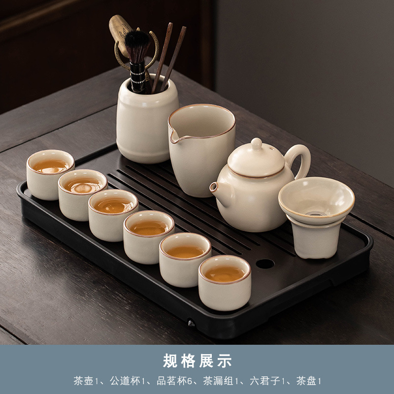 가벼운 고급 고급 차 마시는 중국 스타일 베이지 색 Ruyao 쿵푸 차 세트 세트 가정용 세라믹 주전자 커버 그릇 티 컵 티 트레이