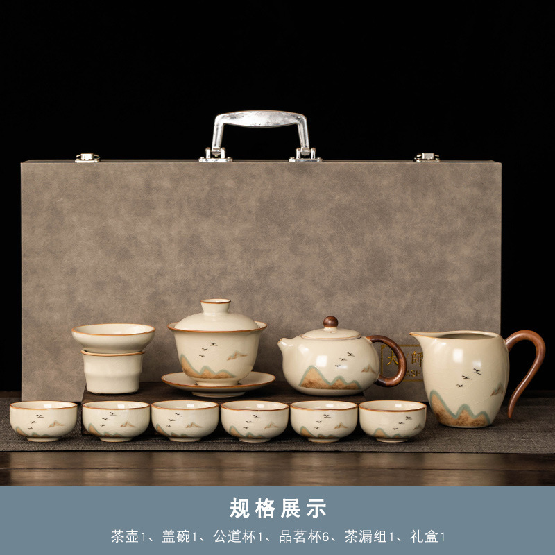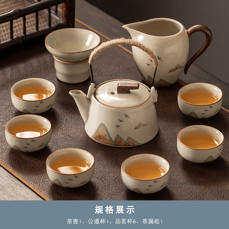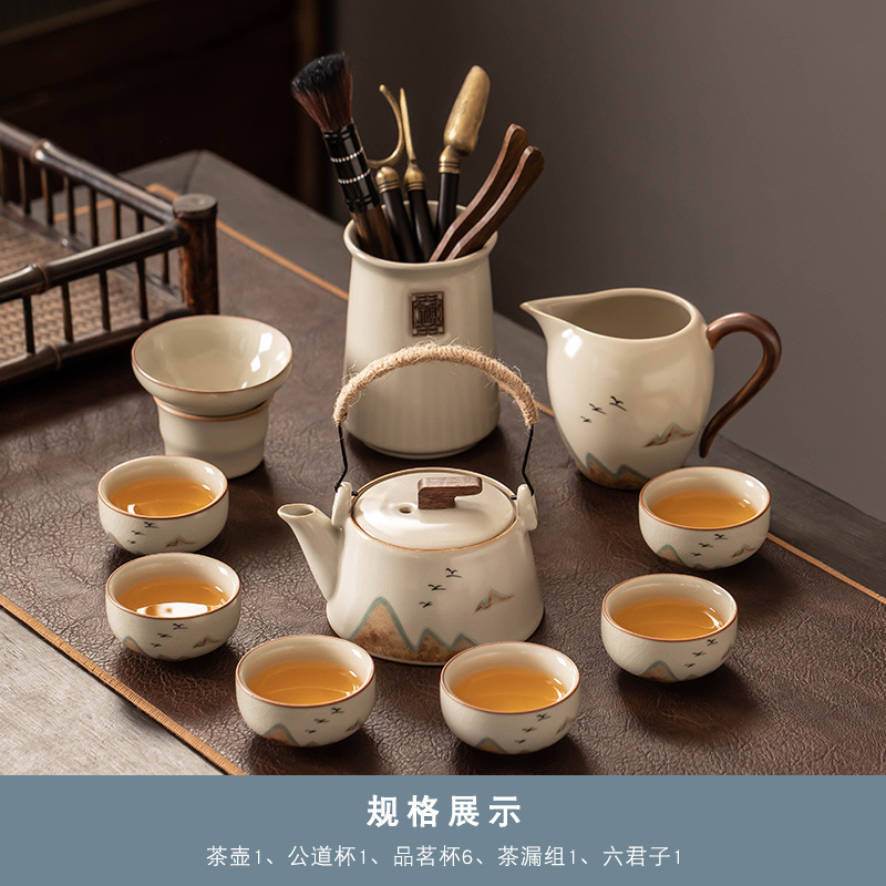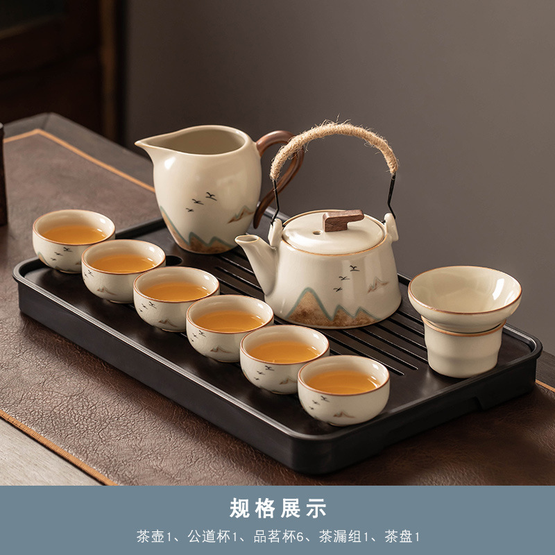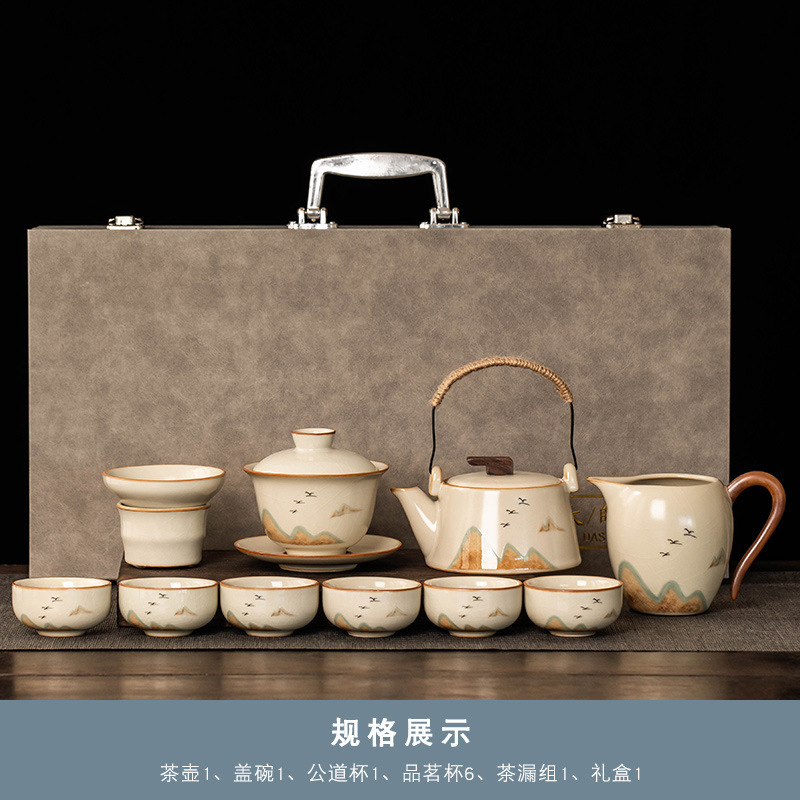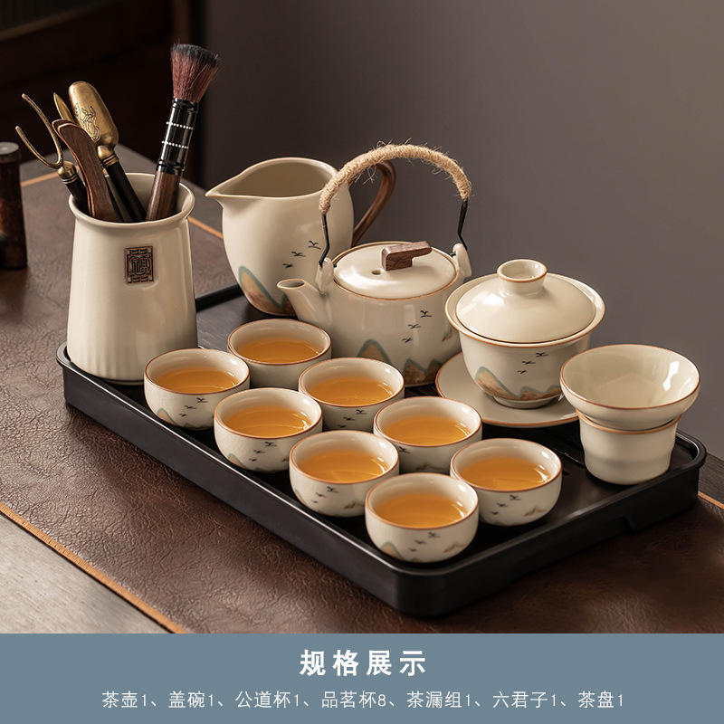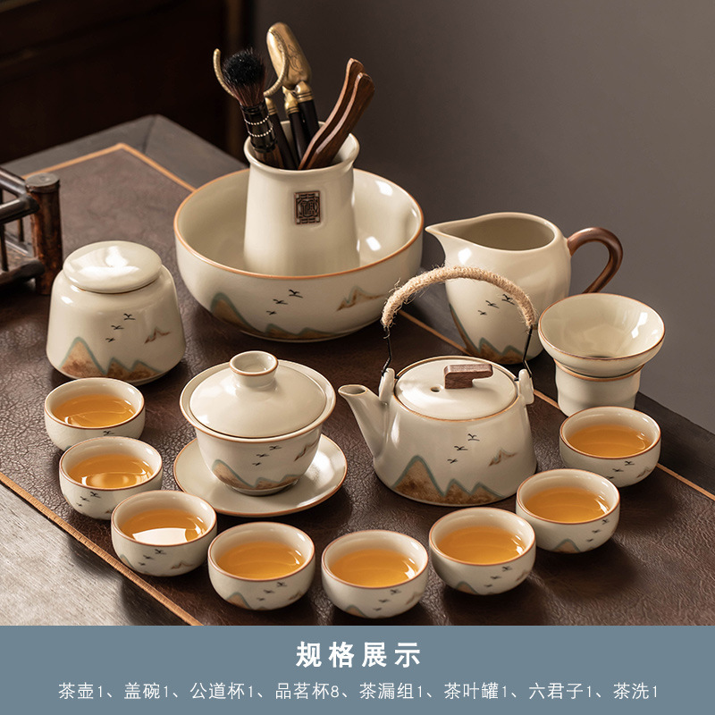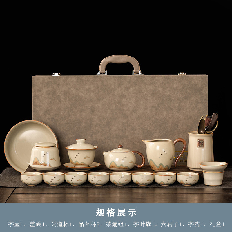 • "베이지 여요 ""먼 산"" 리프트 빔 찻주전자 덮은 그릇 8컵 13종 세트 + 다도 + 차 캔 + 차 세척"
