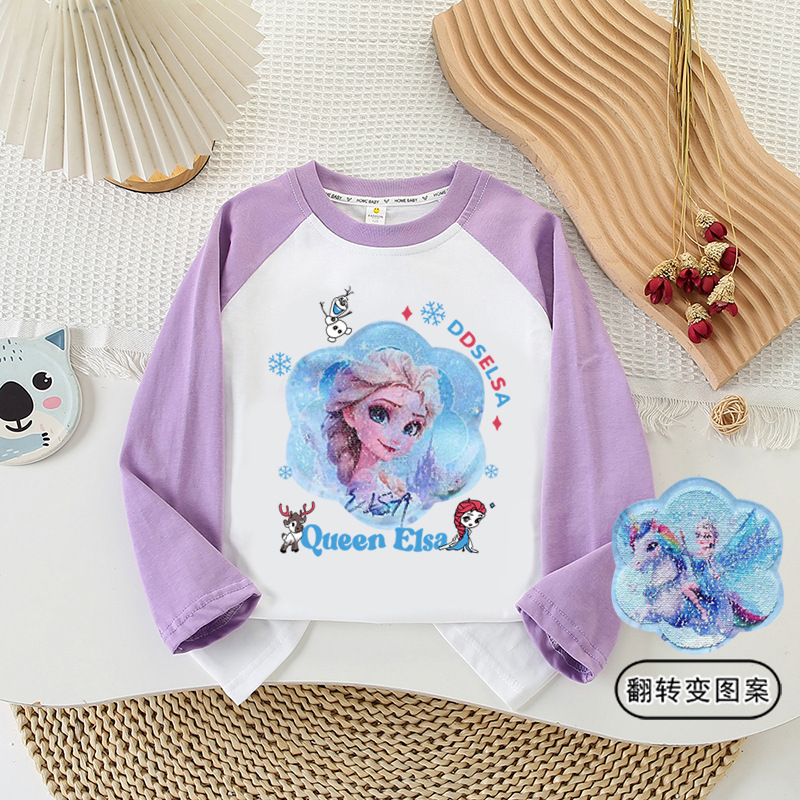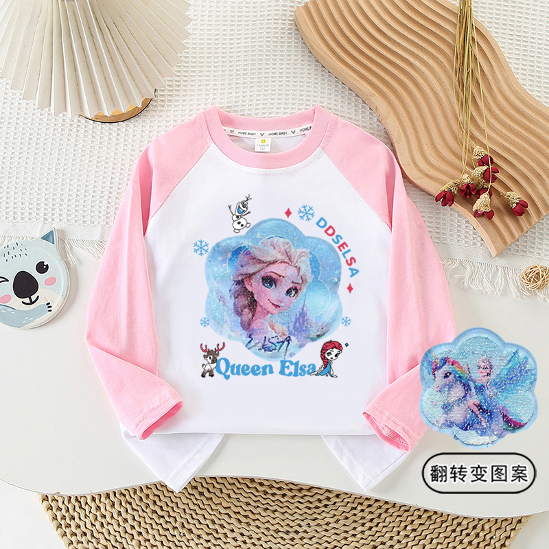 소녀 이른 가을 면화 패치 워크 긴 소매 인쇄 공주 엘사 가역 패턴 시퀀스베이스 탑 봄과 가을