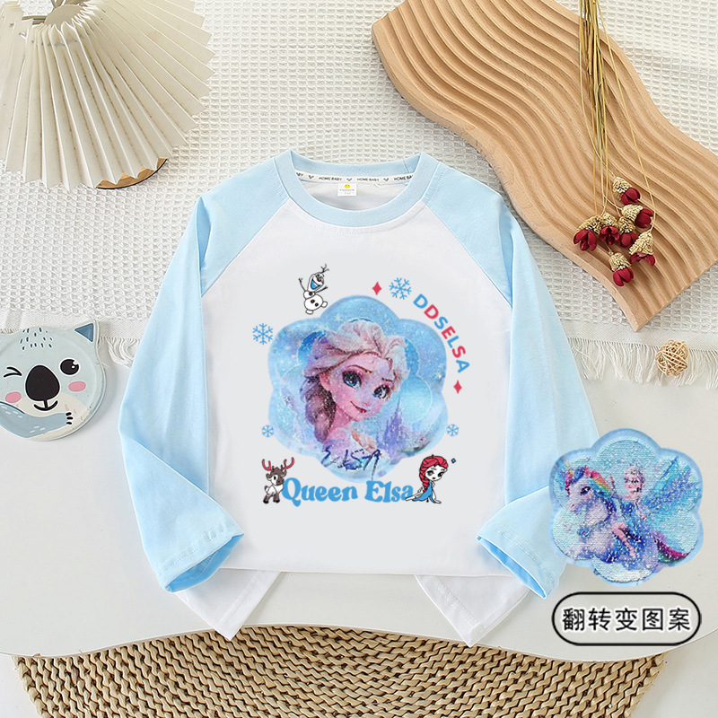 소녀 이른 가을 면화 패치 워크 긴 소매 인쇄 공주 엘사 가역 패턴 시퀀스베이스 탑 봄과 가을스토어 가기