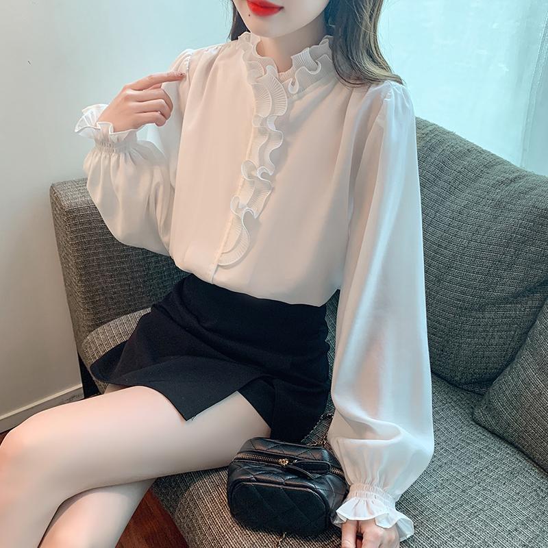 여성을위한 나무 귀를 가진 패션 긴 소매 쉬폰 셔츠 2025 이른 봄 새로운 올 매치 간단한 틈새 세련된 탑스토어 가기