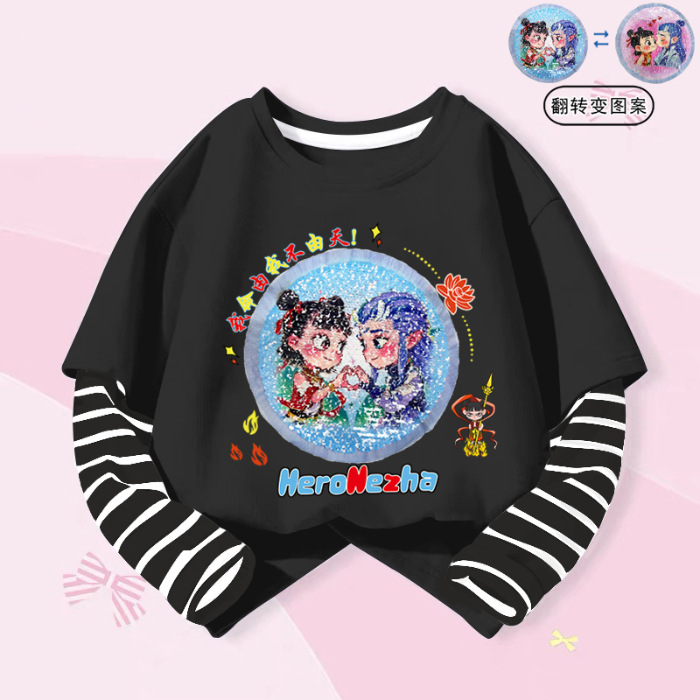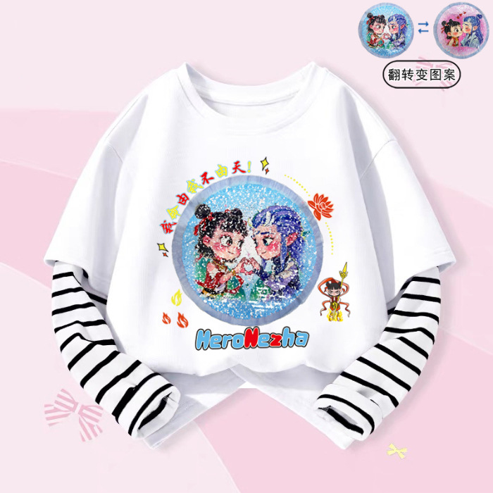 어린 이용 긴팔 퓨어 코튼 페이크 2 피스 캐주얼 탑, 소년 소녀 봄, 가을을위한 가역 패턴 이종 옷