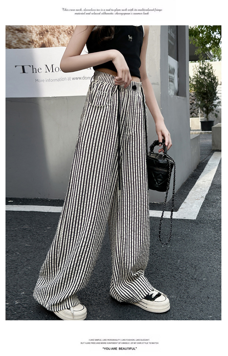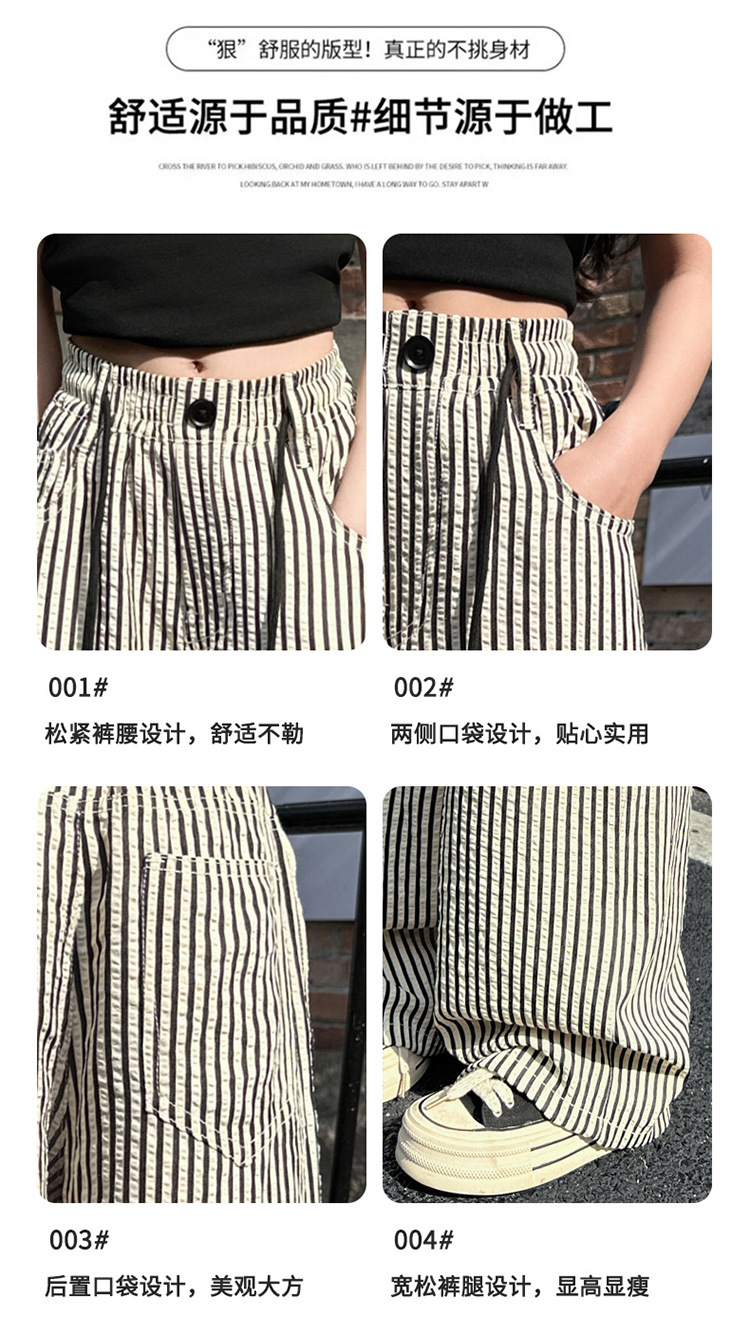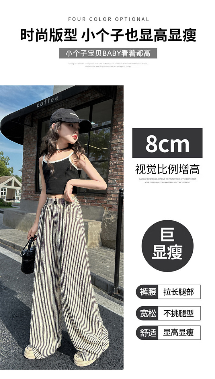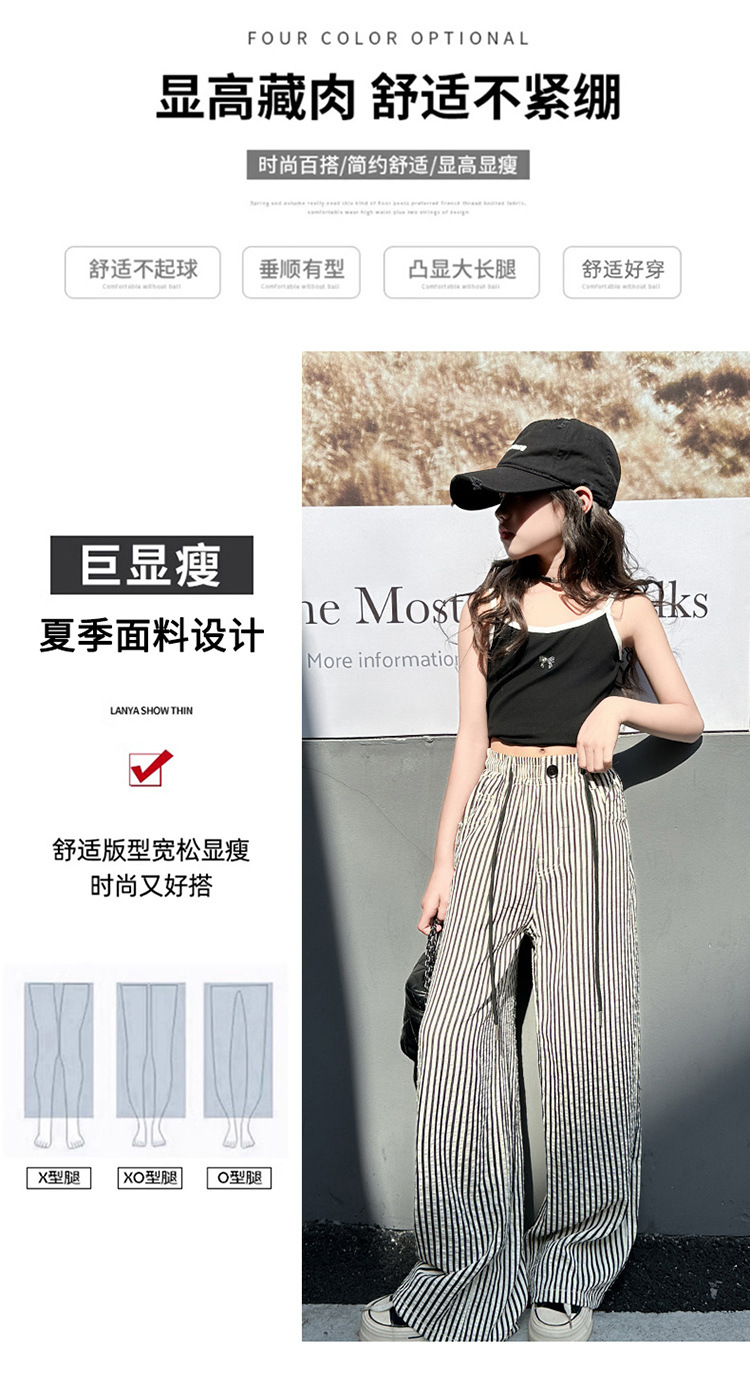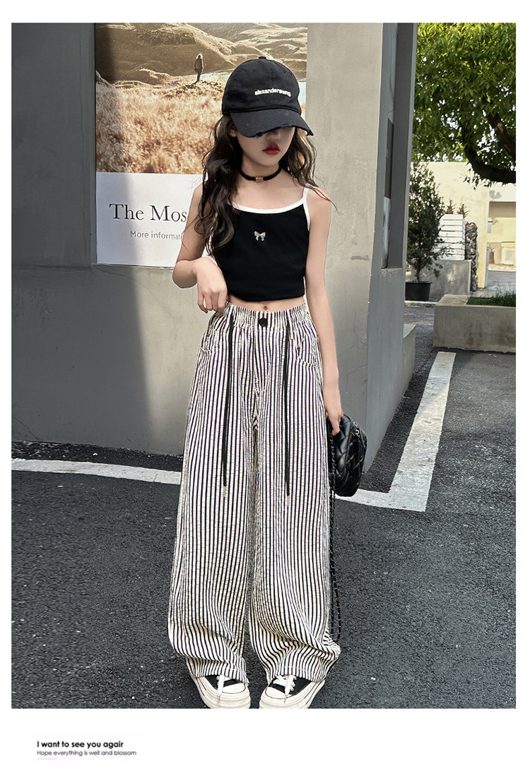 소녀의 새로운 줄무늬 얇은 직선 모기 방지 바지 도매 넓은 다리 바지 2025 여름 느낌 질감 중간 및 대형 어린이의 빠른 건조스토어 가기