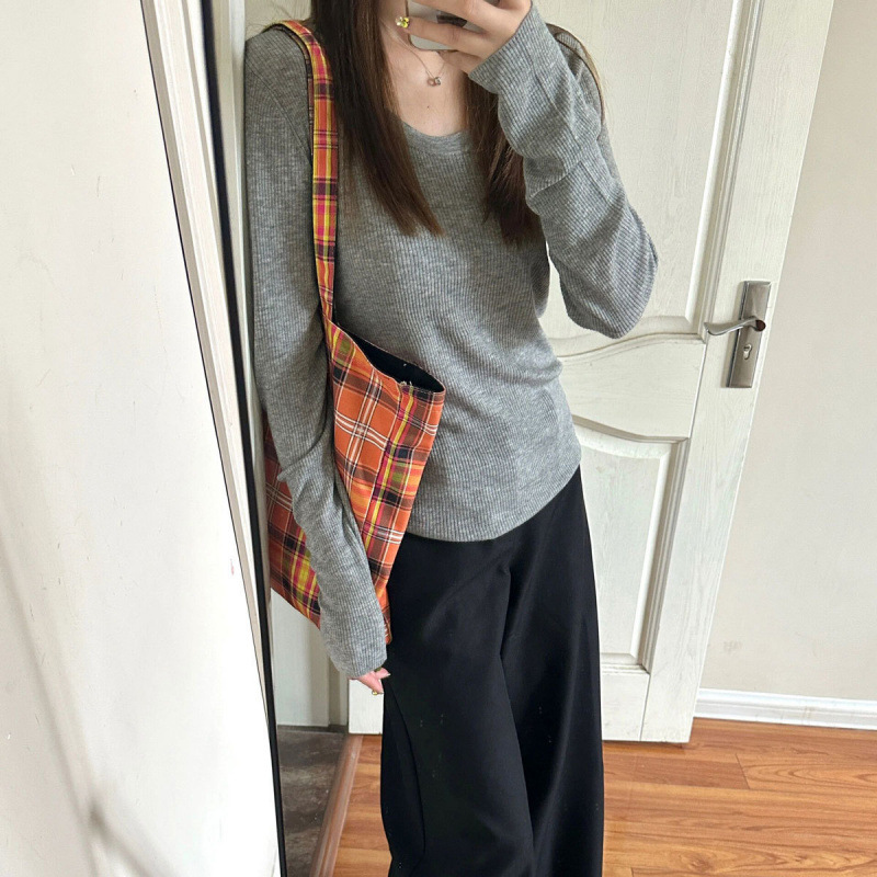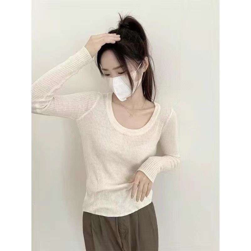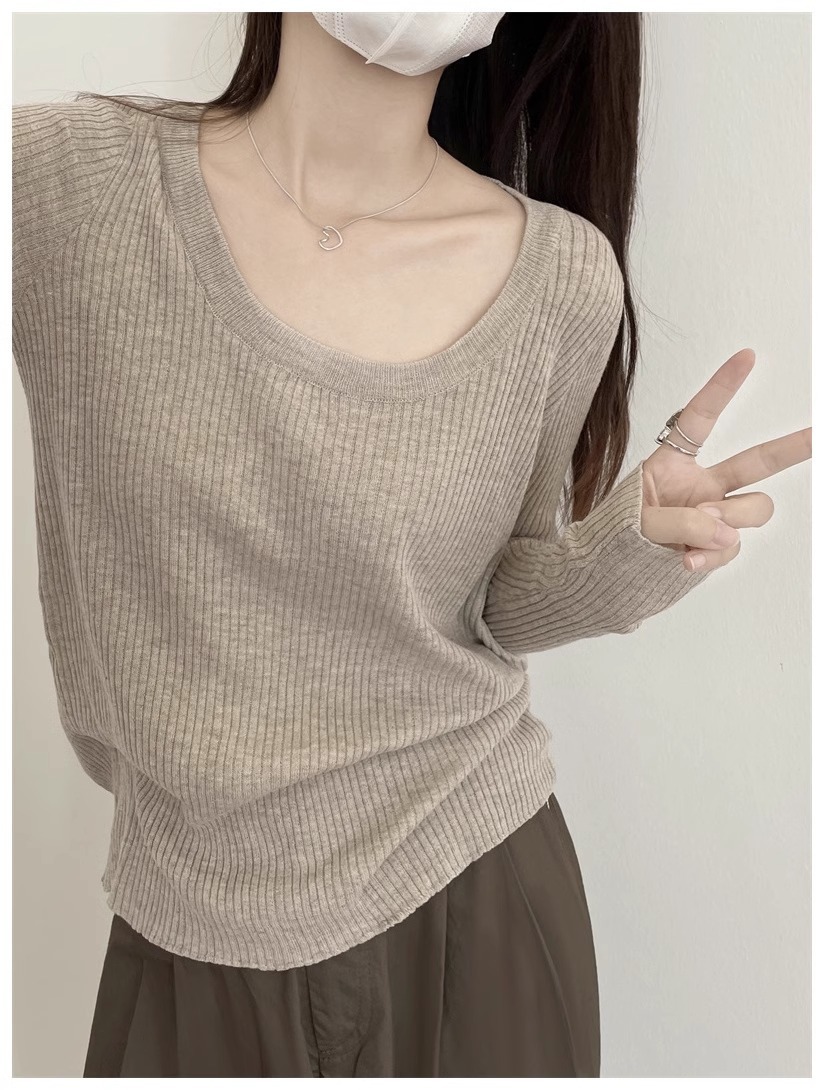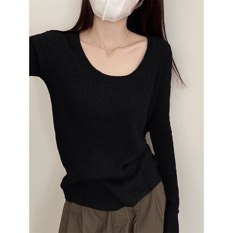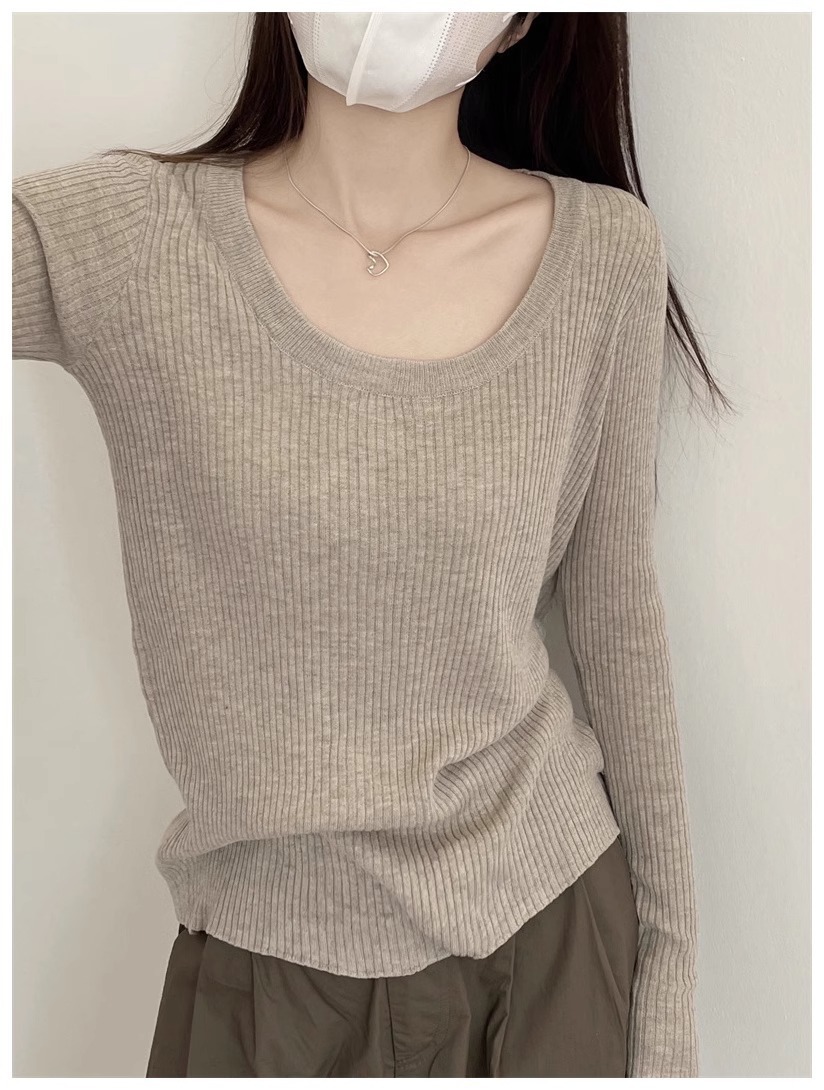 회색 U-목 쇄골 니트 스웨터 내베이스 셔츠 긴 소매 티셔츠 여성의 봄과 가을 디자인 틈새 탑스토어 가기