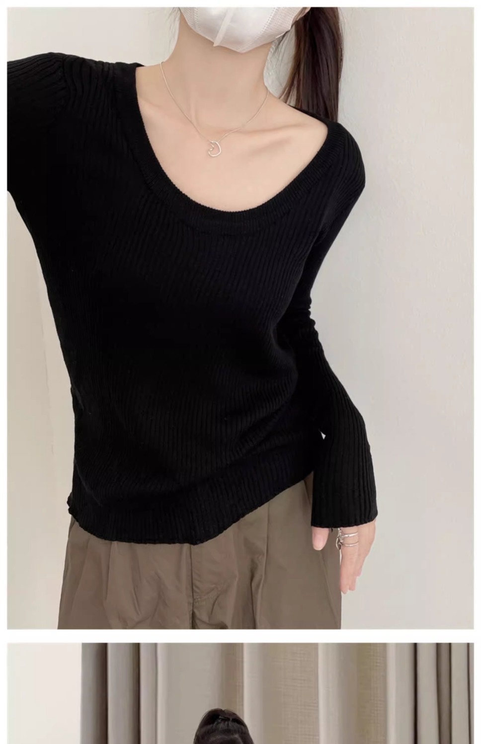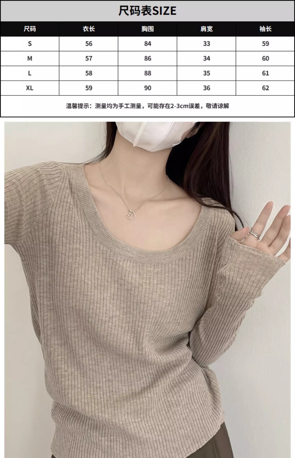 회색 U-목 쇄골 니트 스웨터 내베이스 셔츠 긴 소매 티셔츠 여성의 봄과 가을 디자인 틈새 탑