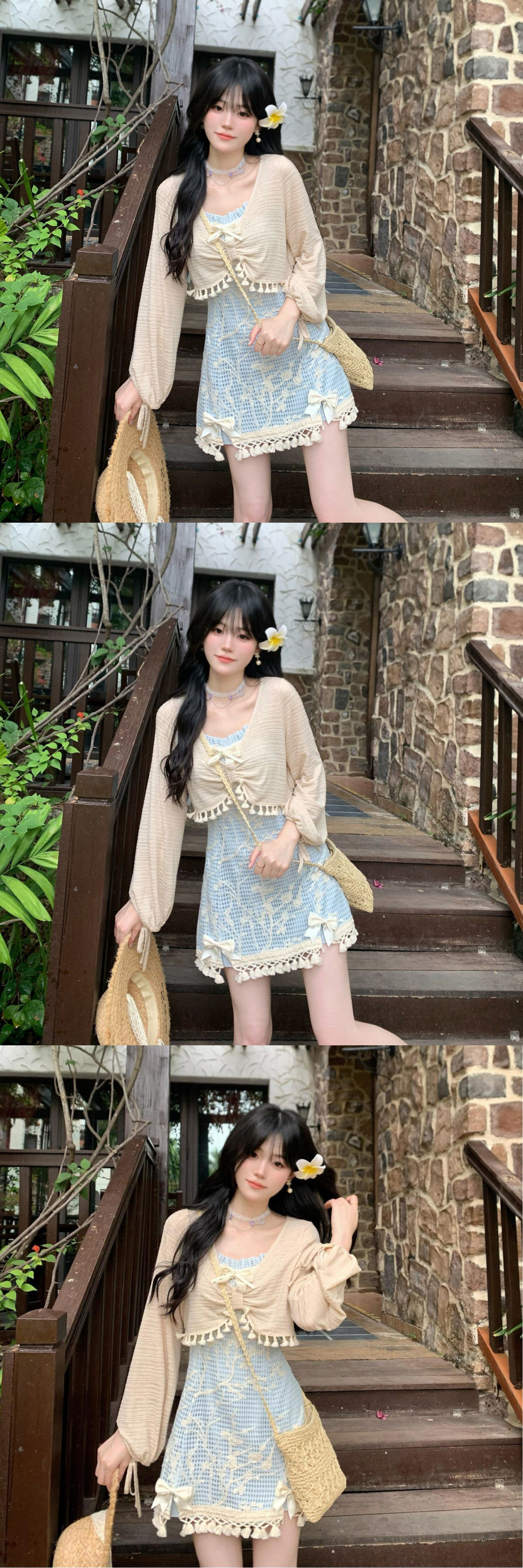 봄 새로운 순수한 달콤한 신선한 자외선 차단제 블라우스 활 스트랩 스커트 투피스 세트스토어 가기