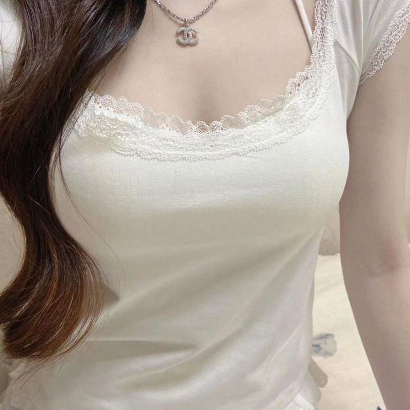 봄과 여름 여성의 2025 순수 욕망 스타일 스위트 레이스 반팔 티셔츠 여성의 새로운 슬림 핏 슬리밍 올 매치 탑스토어 가기