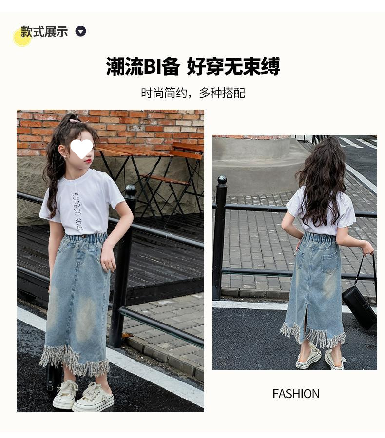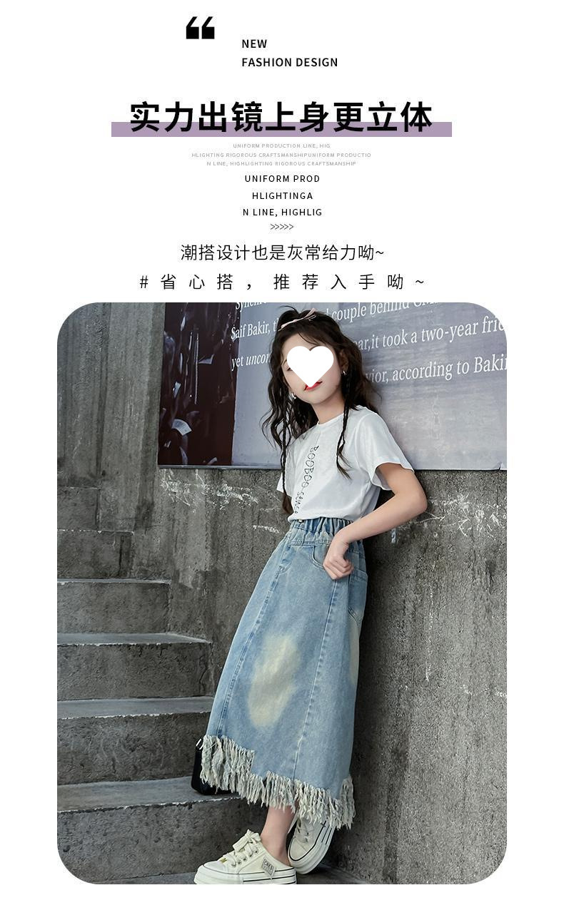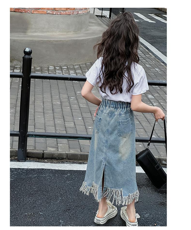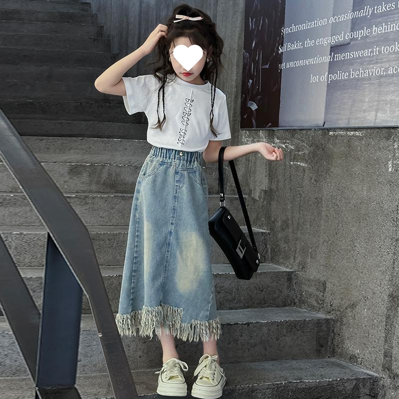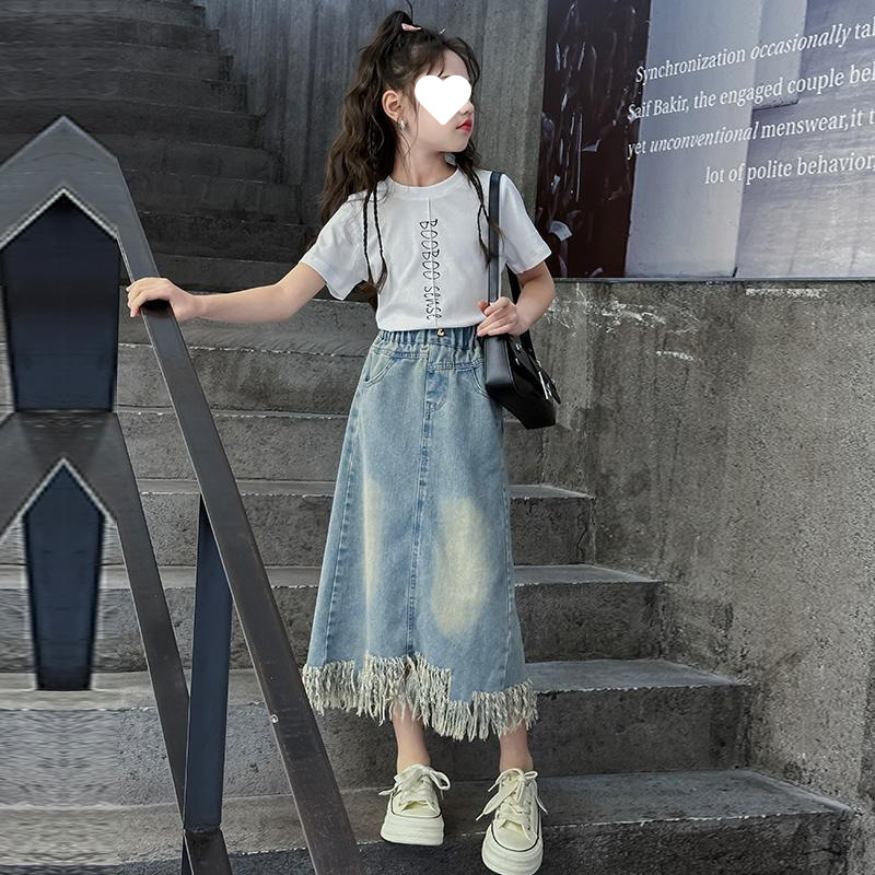 여자 데님 스커트 여름 2025 새로운 한국 스타일 미드 빅 키즈 패셔너블 스커트 세련 된 어린이 긴 세련 된 스커트스토어 가기