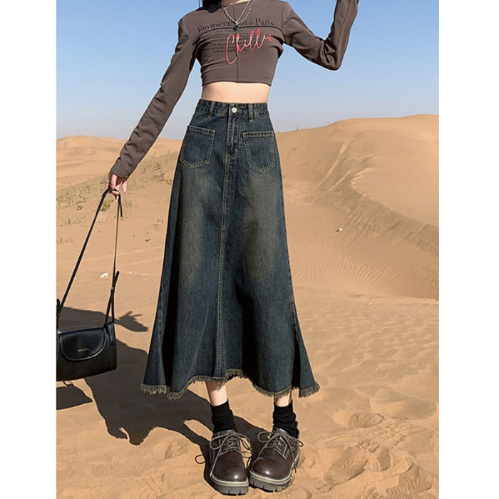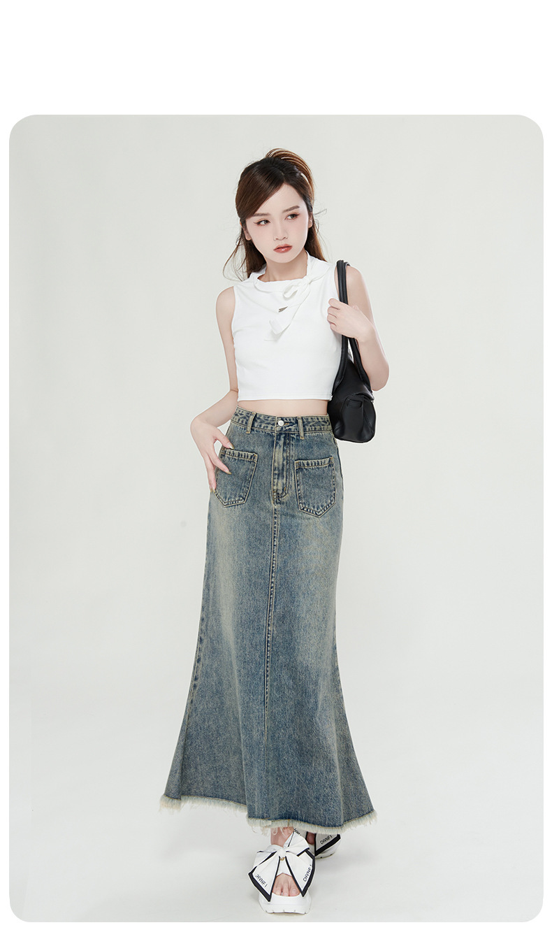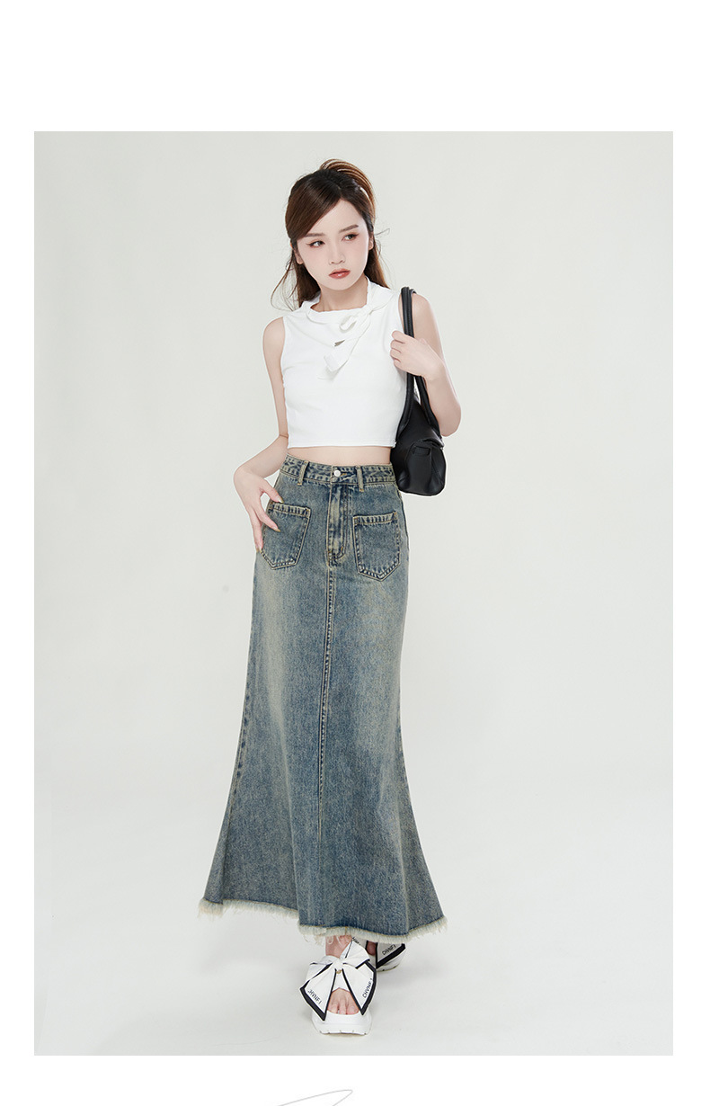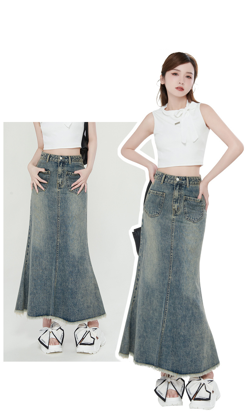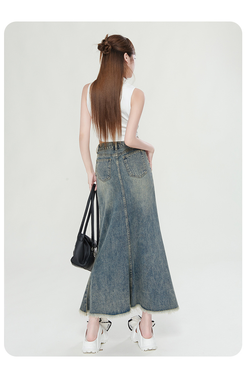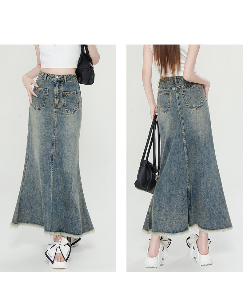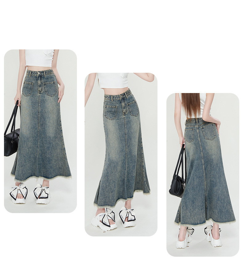 빈티지 데님 치마 여자 2025 년 여름 새로운 높은 허리 A 라인 슬리밍 엉덩이 피쉬 테일 중간 길이 치마스토어 가기