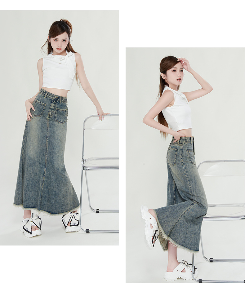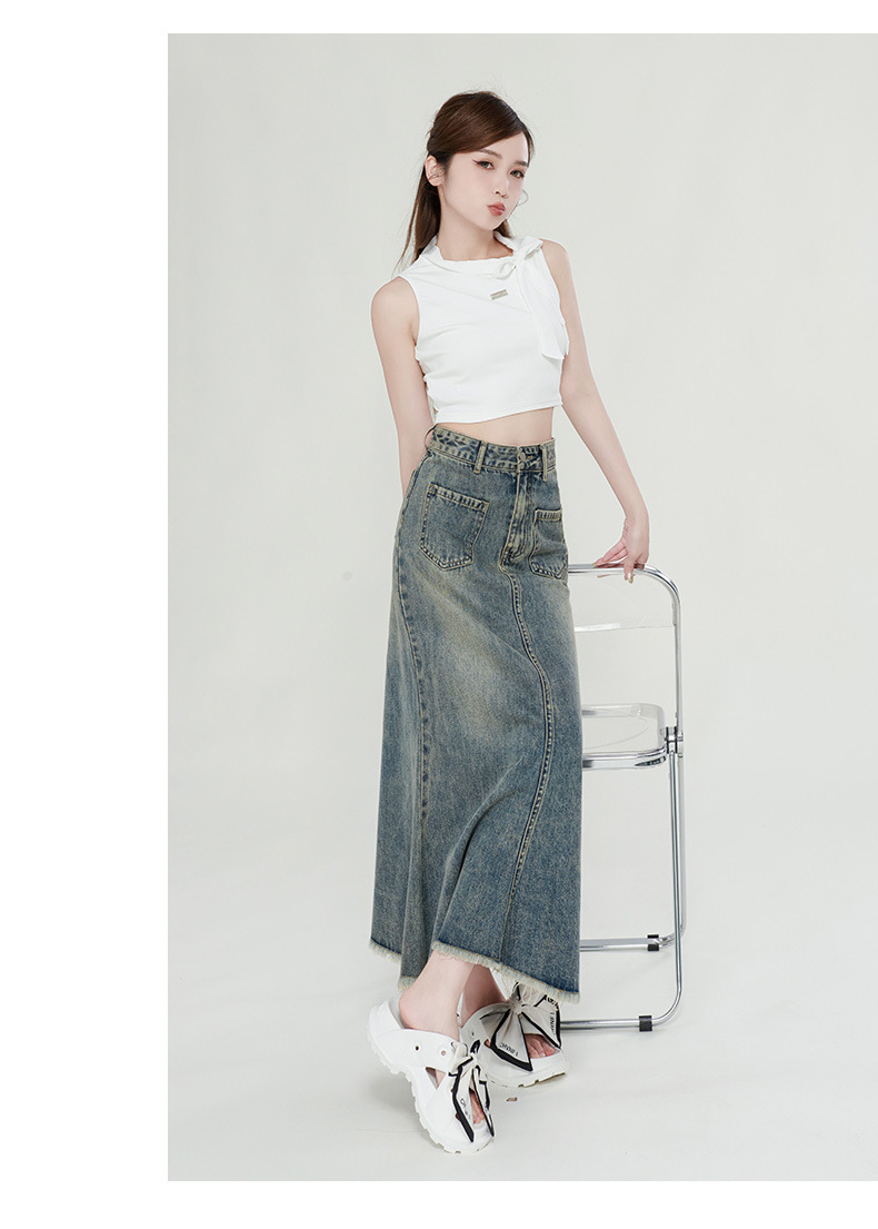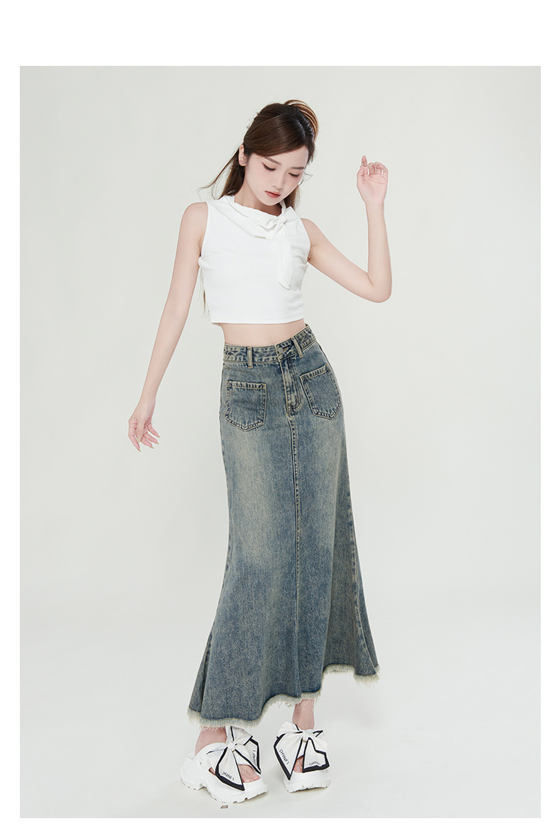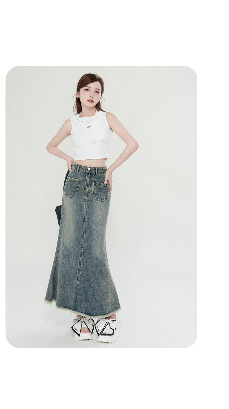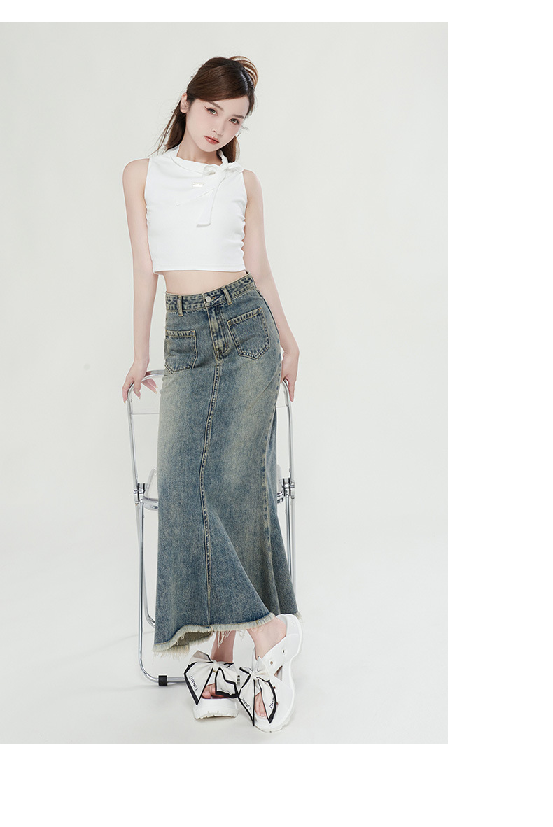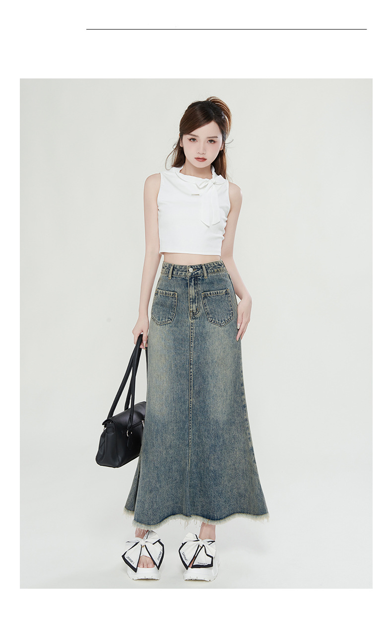 빈티지 데님 치마 여자 2025 년 여름 새로운 높은 허리 A 라인 슬리밍 엉덩이 피쉬 테일 중간 길이 치마스토어 가기