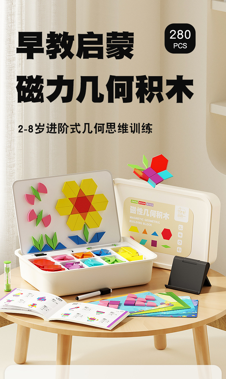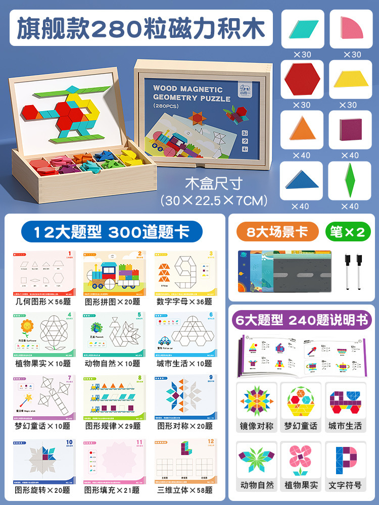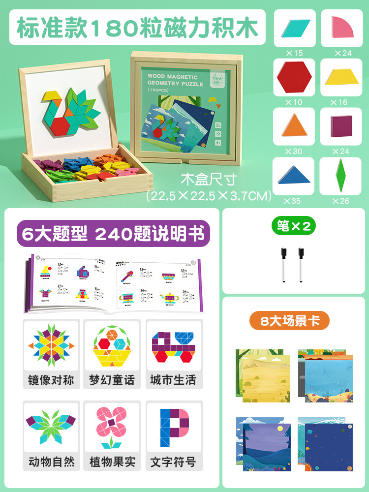 • 210개의 자기 기하학 퍼즐 빌딩 블록 240개의 고급 사고 훈련 질문 [나무 상자 보관]