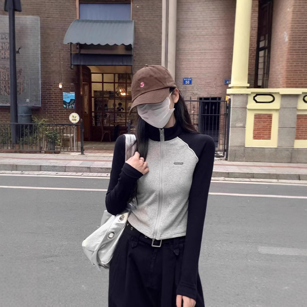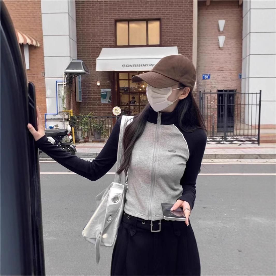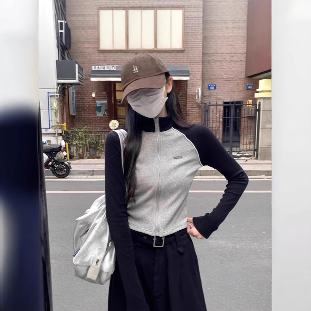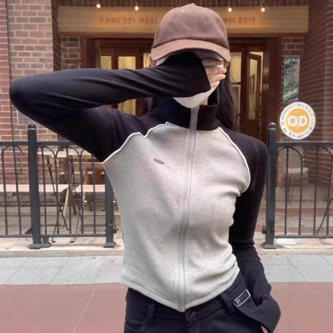 2025 새로운 미국 콘트라스트 컬러 라글란 슬리브 여성용 스레드 접합 긴 소매 티셔츠, 여성용 지퍼 봄과 가을 재킷
