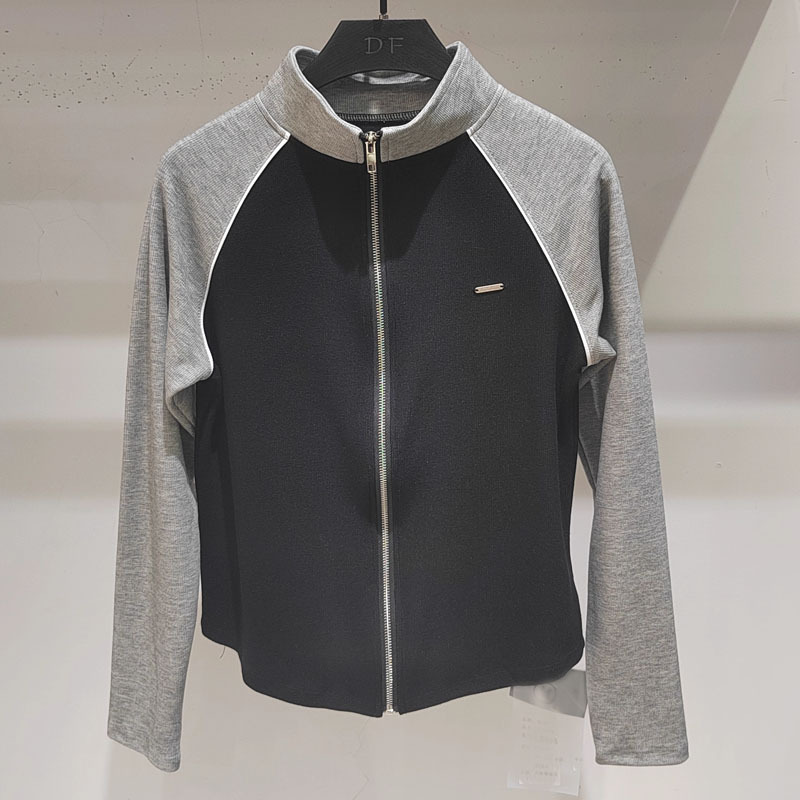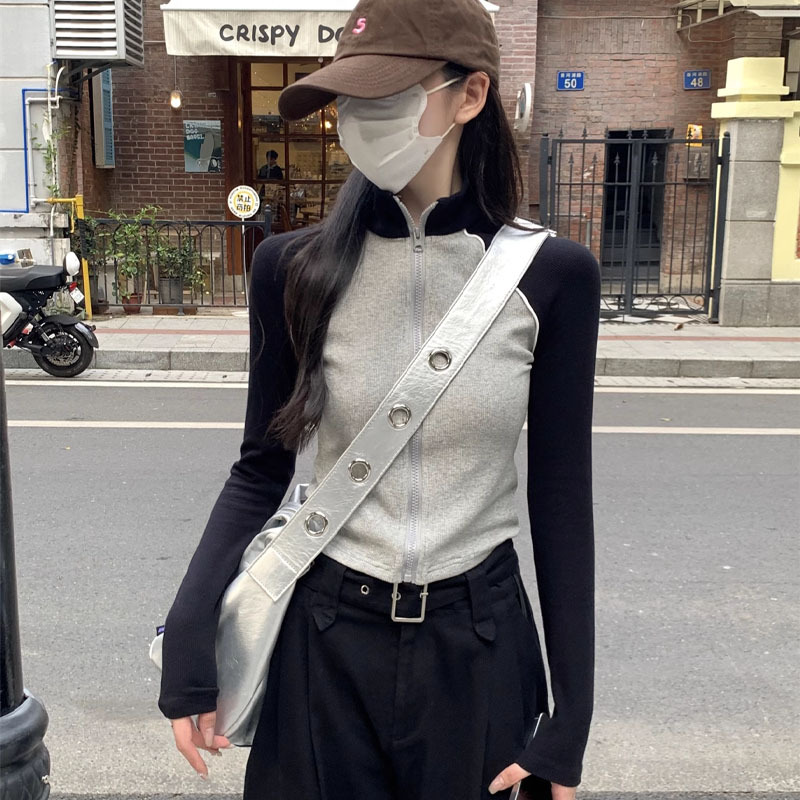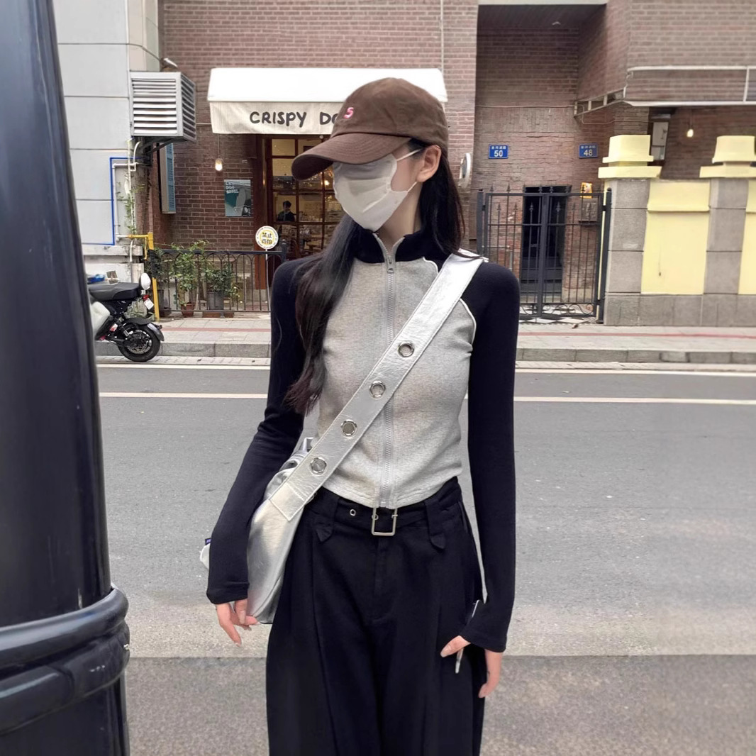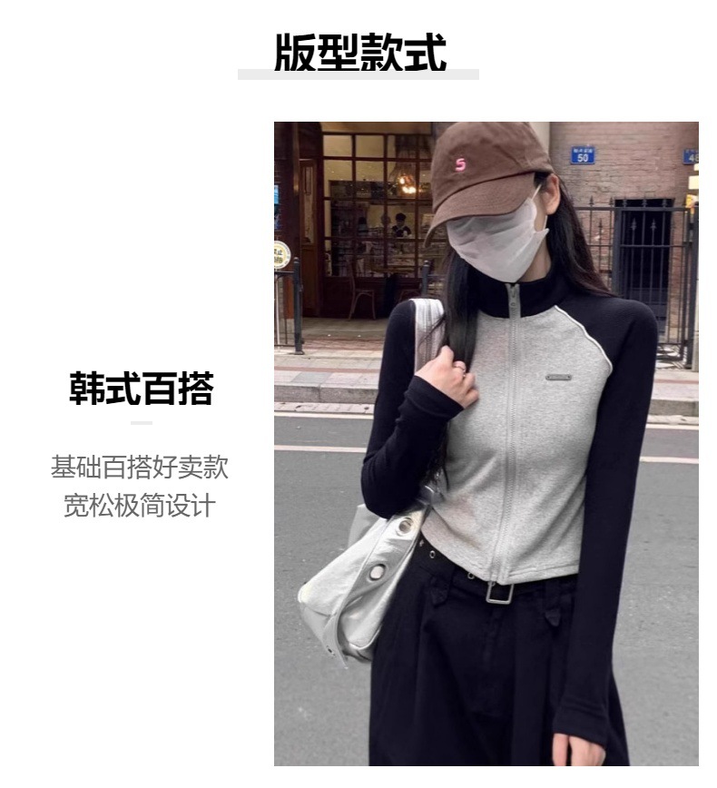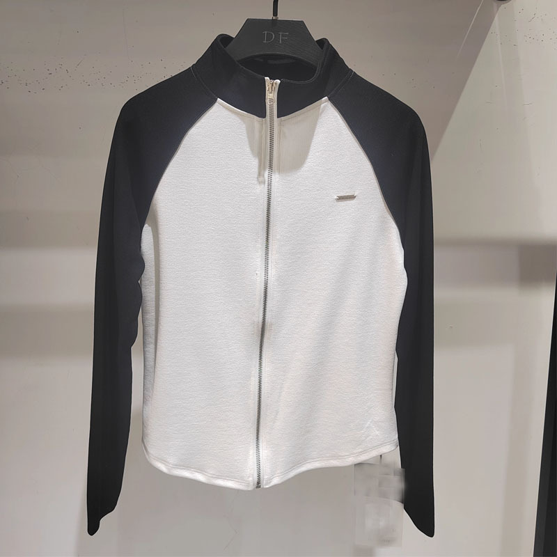 2025 새로운 미국 콘트라스트 컬러 라글란 슬리브 여성용 스레드 접합 긴 소매 티셔츠, 여성용 지퍼 봄과 가을 재킷
