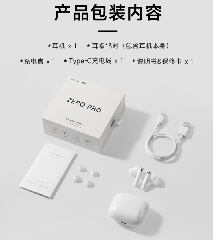 耳机×2、充电盒×1、Type-C充电线×1、耳帽×3对、说明书&保修卡×1