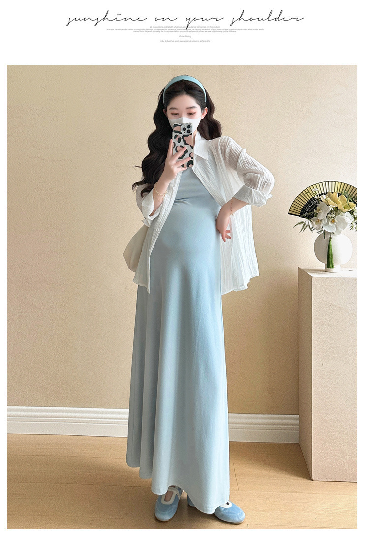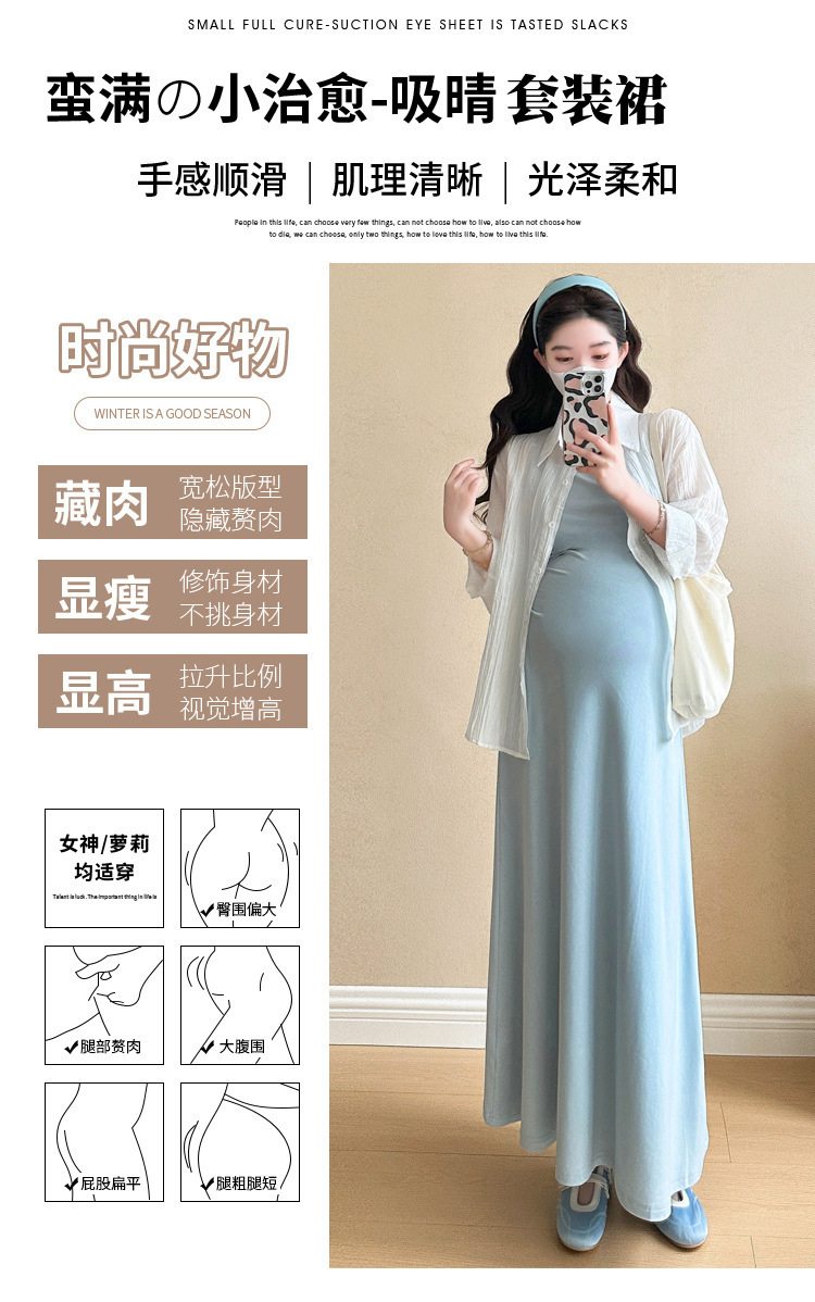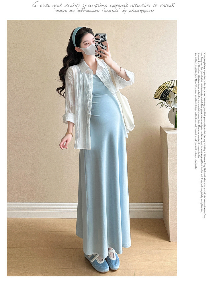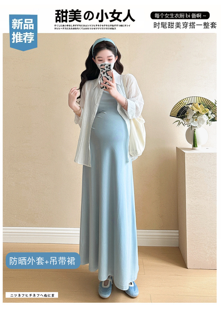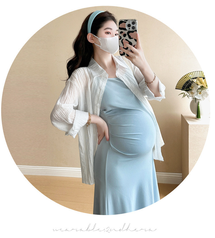 2025 여름 출산 원피스 프랑스 간단한 두 조각 새로운 긴팔 셔츠 주름 디자인 임산부 여성 슬립 스커트스토어 가기